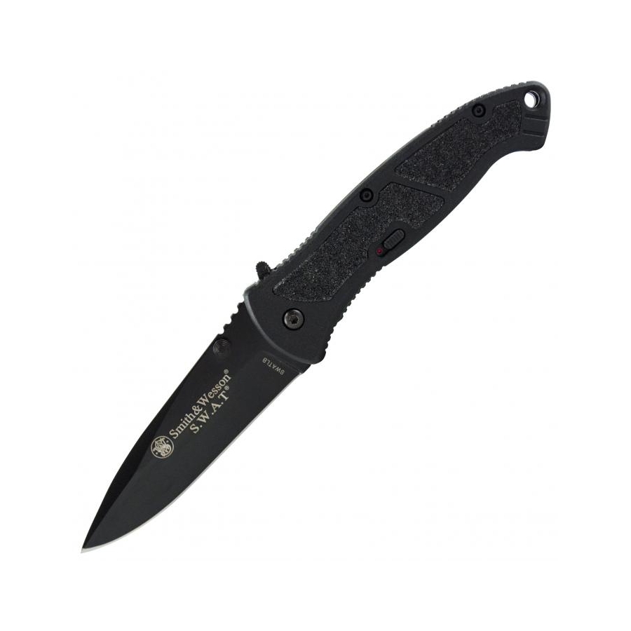 Couteau de la série S.W.A.T. de la société Smith & Wesson avec lame lisse et ouverture assistée M.A.G.I.C. Vous pouvez commencer à ouvrir le couteau avec votre pouce comme les autres couteaux et la lame termine le mouvement, ou vous pouvez appuyer sur le cran de sûreté avec votre index. Lame en acier inoxydable 4034 et manche en aluminium avec plaquettes rugueuses.