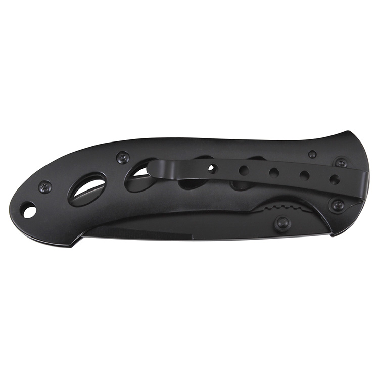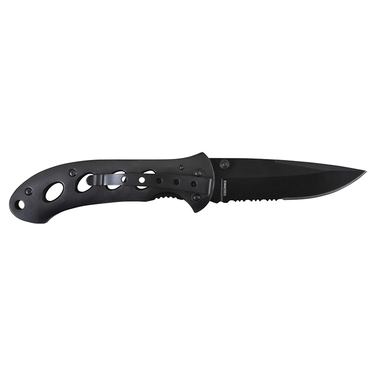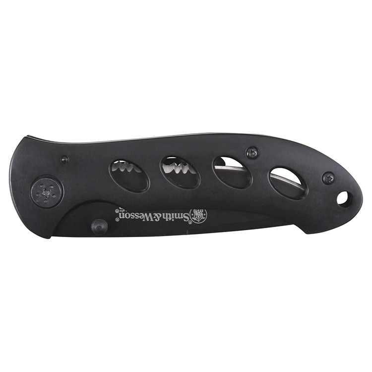 Couteau pliant Smith & Wesson à lame lisse. La lame et le manche sont en acier inoxydable avec un revêtement en titane. Clip pour fixation à la ceinture ou à la poche.