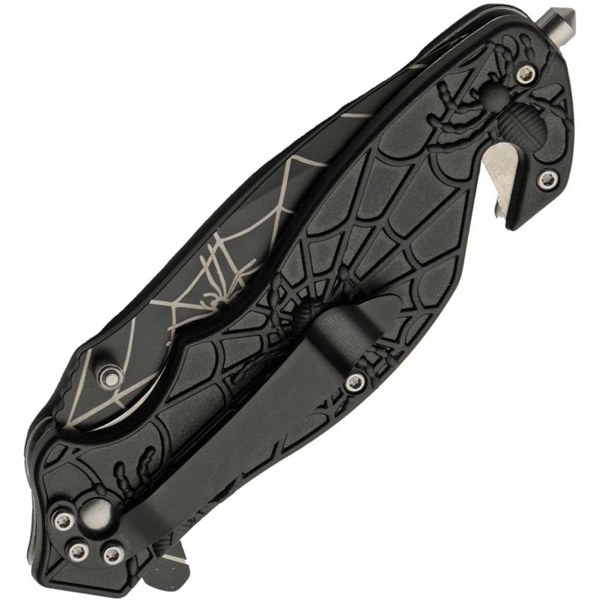 Couteau pliant orné de motifs représentant des araignées et des toiles d'araignées. Lame à double tranchant en acier inoxydable, manche en plastique ABS. Clip de poche, verrouillage LinerLock, brise-vitre, coupe-ceinture. Plus d'informations