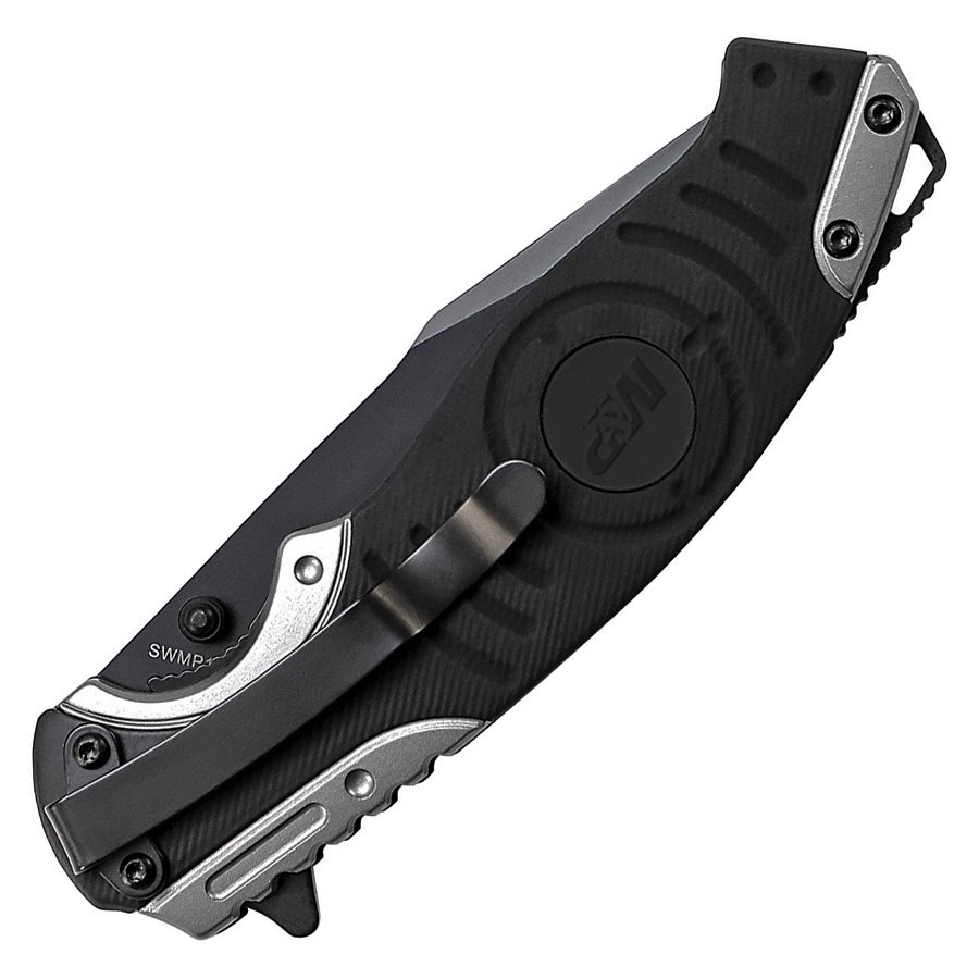 Couteau pliant classique à lame combinée. La lame en forme de drop point est fabriquée en acier inoxydable noirci et équipée d'un cran double face pour une ouverture facile. La lame est en forme ouverte. Le manche est fortement profilé et fabriqué en aluminium avec une surface caoutchoutée. Il est bien entendu équipé d'un clip de poche métallique et d'un trou pour passer un cordon.