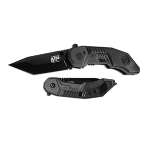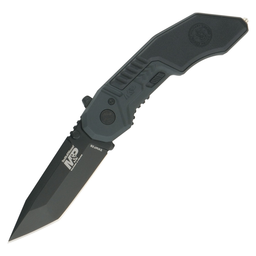 Couteau SWMP3 de la série Military and Police de Smith Wesson avec ouverture assistée MAGIC. Lame en acier inoxydable 4034 et manche en aluminium. À l'extrémité du manche se trouve une pointe permettant de briser les vitres. Plus d'informations