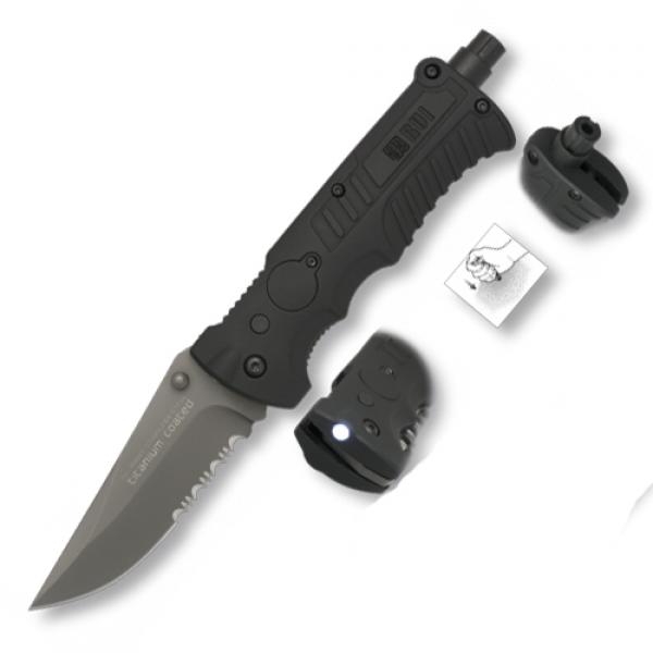 Couteau pliant de la marque K25 avec lampe torche. La lame est en acier inoxydable avec revêtement en titane. Le manche est en aluminium caoutchouté noir. Livré avec un étui en nylon. Plus d'informations