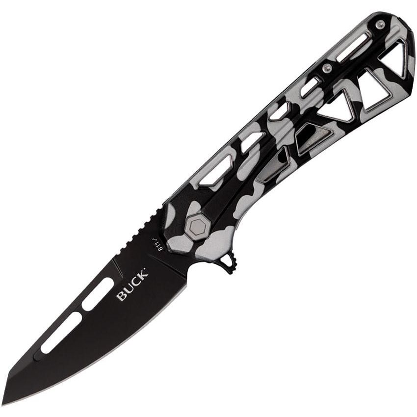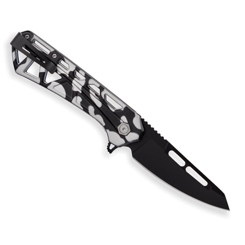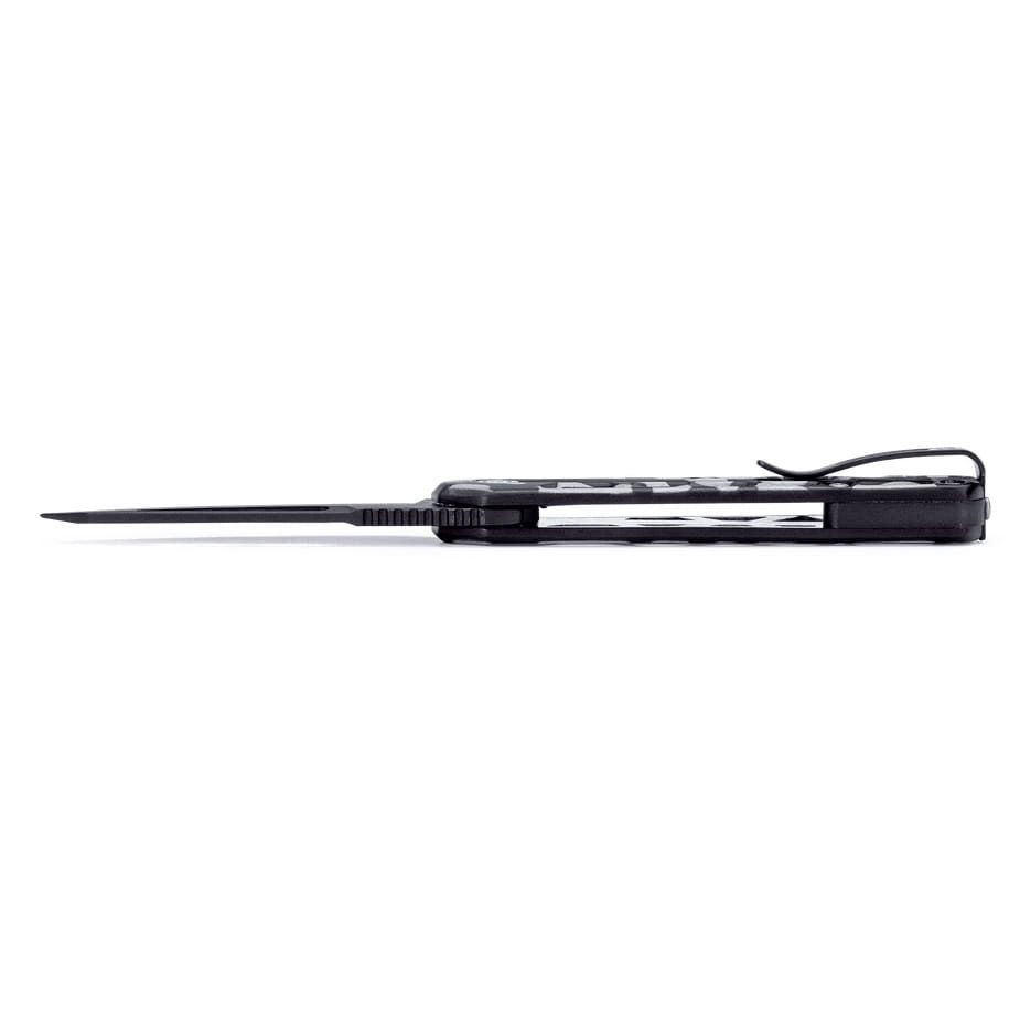 Couteau léger dont le concept s'inspire des couteaux tactiques classiques. La lame à tranchant lisse de forme Tanto est fabriquée en acier inoxydable 7Cr17MoV et dispose d'une surface noircie qui limite les reflets indésirables dans les situations où une discrétion totale est requise. La lame est dotée d'une surface pour le pouce sur le dos. Pour une ouverture rapide, le couteau dispose d'un flipper prononcé complété par un roulement à billes pour un fonctionnement fluide. En position ouverte, le couteau est sécurisé par un verrou LinerLock, dont le mécanisme se trouve sur le bord inférieur du manche.