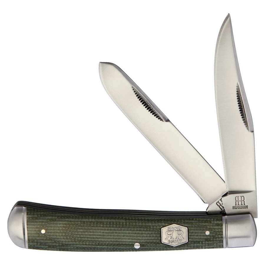 Couteau de chasse pliant aux couleurs discrètes, avec deux lames à tranchant lisse. Le manche est fabriqué en Micarta avec une structure légèrement textile. Une plaque métallique du fabricant Rough Ryder est placée sur le manche. Lame lisse.