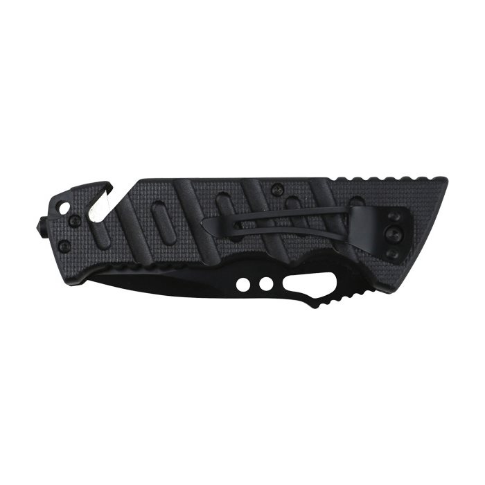 Couteau tactique de poche à lame lisse, équipé d'un brise-vitre et d'un coupe-ceinture. Un clip de poche est situé à l'arrière du manche et un trou est prévu à l'extrémité du manche pour y passer un cordon. Le couteau est verrouillé en position ouverte par un système LinerLock. clip de poche, tandis qu'un trou destiné à passer un cordon est situé à l'extrémité du manche. Le couteau est verrouillé en position ouverte par un cran LinerLock.