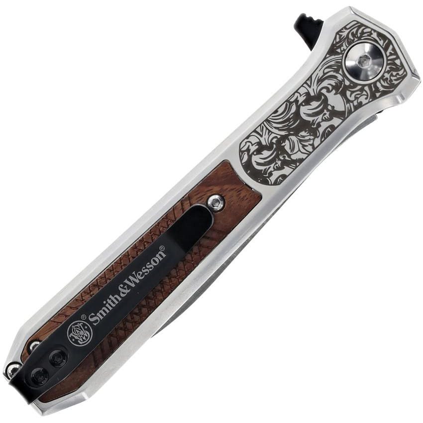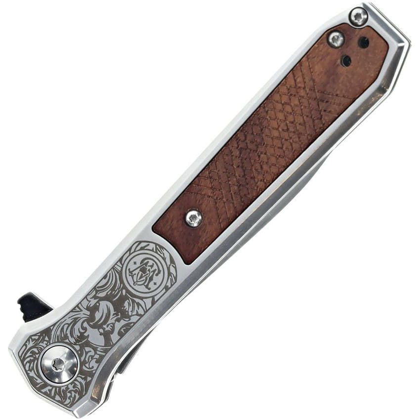 Couteau pliant élégant avec ouverture assistée par ressort. La lame en forme de poignard avec faux tranchant supérieur est fabriquée en acier inoxydable 8Cr13Mov à haute teneur en carbone dans l'alliage. En position ouverte, le couteau est sécurisé par un verrouillage LinerLock fiable. Pour faciliter l'ouverture, le couteau est équipé d'un flipper relativement prononcé. Le manche est agréablement profilé et a été fabriqué à partir d'une combinaison d'acier inoxydable et d'une incrustation en palissandre. Il est bien entendu équipé d'un clip de poche métallique pouvant être monté des deux côtés du manche. Le couteau convient donc aussi bien aux gauchers qu'aux droitiers.
