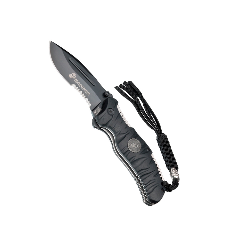 Couteau pliant à lame combinée. Longueur totale du couteau 21 cm, lame en acier inoxydable 440, manche en nylon caoutchouté. Plus d'informations