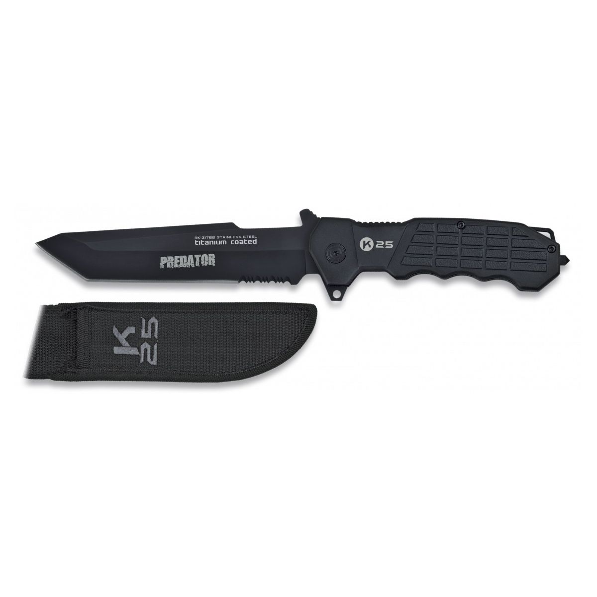 Couteau intégral Predator de couleur noire, fabriqué par le fabricant espagnol K25. Lame en acier inoxydable avec revêtement en titane. Manche métallique sur couteau intégral. Pointe brise-vitre à l'extrémité du manche. Étui simple en nylon. Plus d'informations