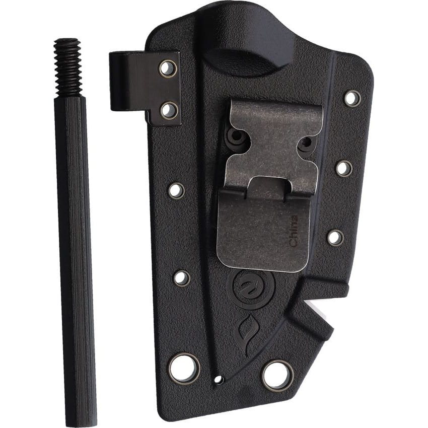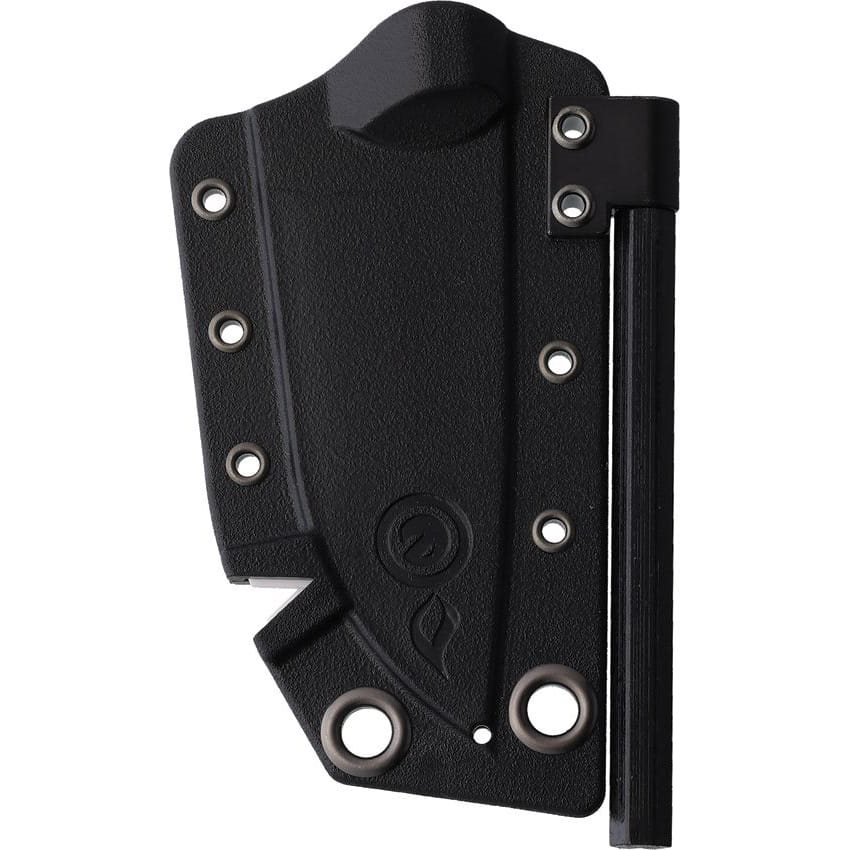 Le couteau est livré avec un étui en plastique résistant qui peut être fixé horizontalement ou verticalement. L'étui est également équipé d'une pierre à aiguiser en céramique et d'un silex en ferrocérium remplaçable.