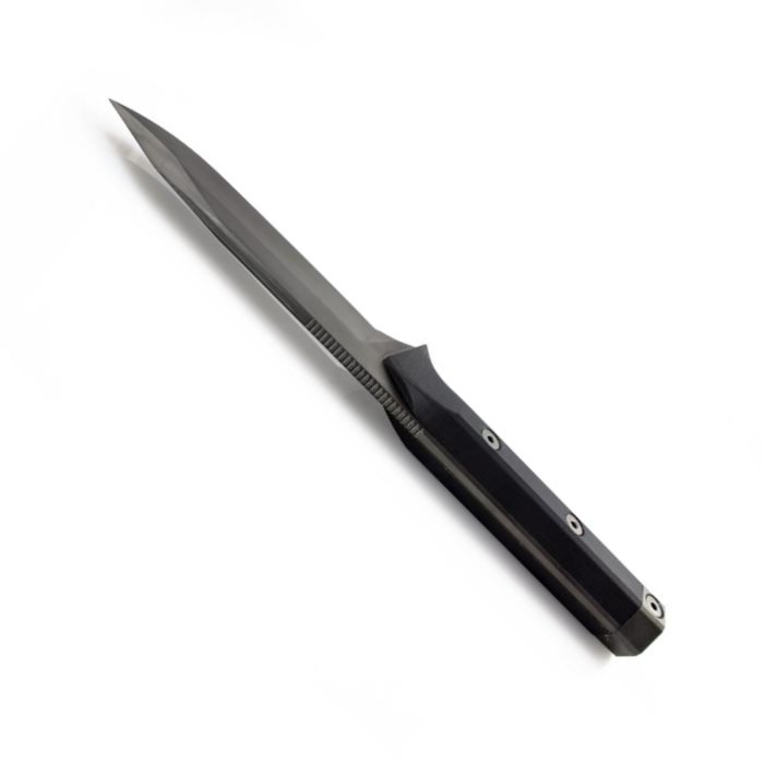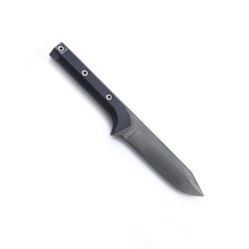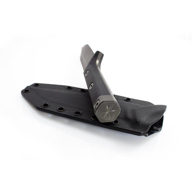 La lame du couteau est de couleur noire, avec un affûtage lisse en haut et en bas. Elle est fabriquée en acier trempé N690 de très haute qualité, d'une dureté de 58-60 HRc. L'épaisseur de la lame est de 4,5 mm, la longueur du tranchant supérieur est de 31 mm et la longueur du tranchant inférieur est de 123 mm. Le dos de la lame est rugueux, ce qui facilite les travaux manuels délicats et permet l'utilisation d'un briquet. Les bords de la lame sont chanfreinés pour une prise en main confortable, la lame s'intégrant harmonieusement aux autres parties du couteau. La forme de la pointe du couteau symbolise la partie avant d'un char vu de profil. La lame bénéficie d'un traitement DLC spécial à base de carbone.