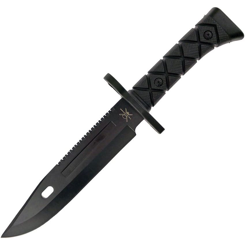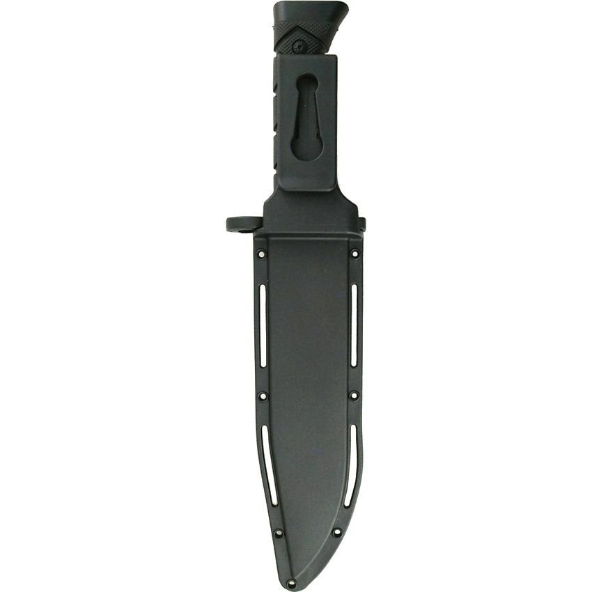 Couteau Bowie massif livré avec un étui pratique pour ceinture. La lame à tranchant lisse est fabriquée en acier inoxydable 3Cr13 et est équipée d'une scie dans sa partie supérieure. Le manche légèrement incurvé est fabriqué en plastique ABS moulé avec une surface antidérapante caoutchoutée. La partie avant du manche est dotée d'une garde robuste qui empêche la main de glisser et de se blesser avec la lame.