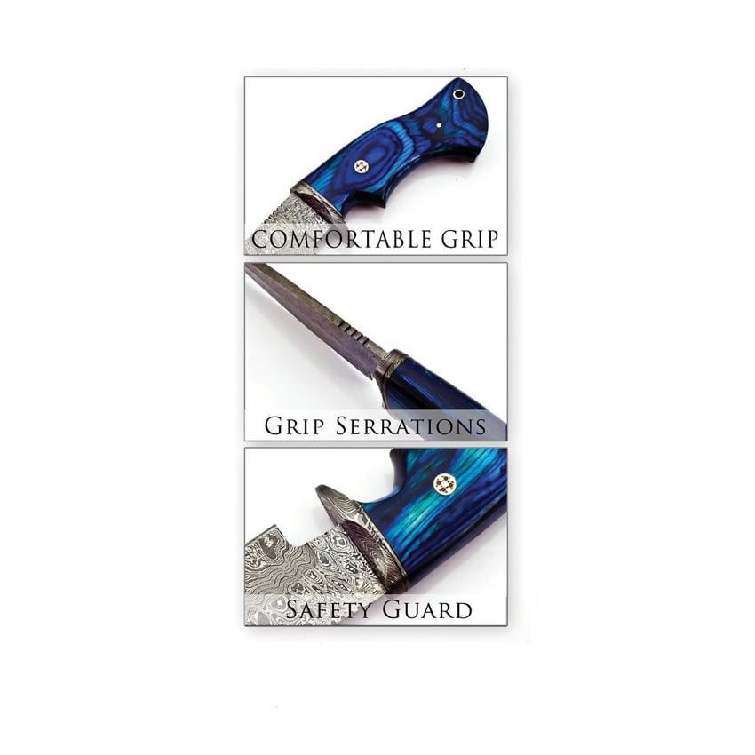 Couteau élégant à lame fixe. La lame à tranchant lisse est incurvée et dotée d'une surface pour le pouce dans sa partie supérieure. Pour plus de sécurité, le couteau est équipé d'une garde en acier damassé. Le manche bleu est en bois Pakkawood. Plus d'informations