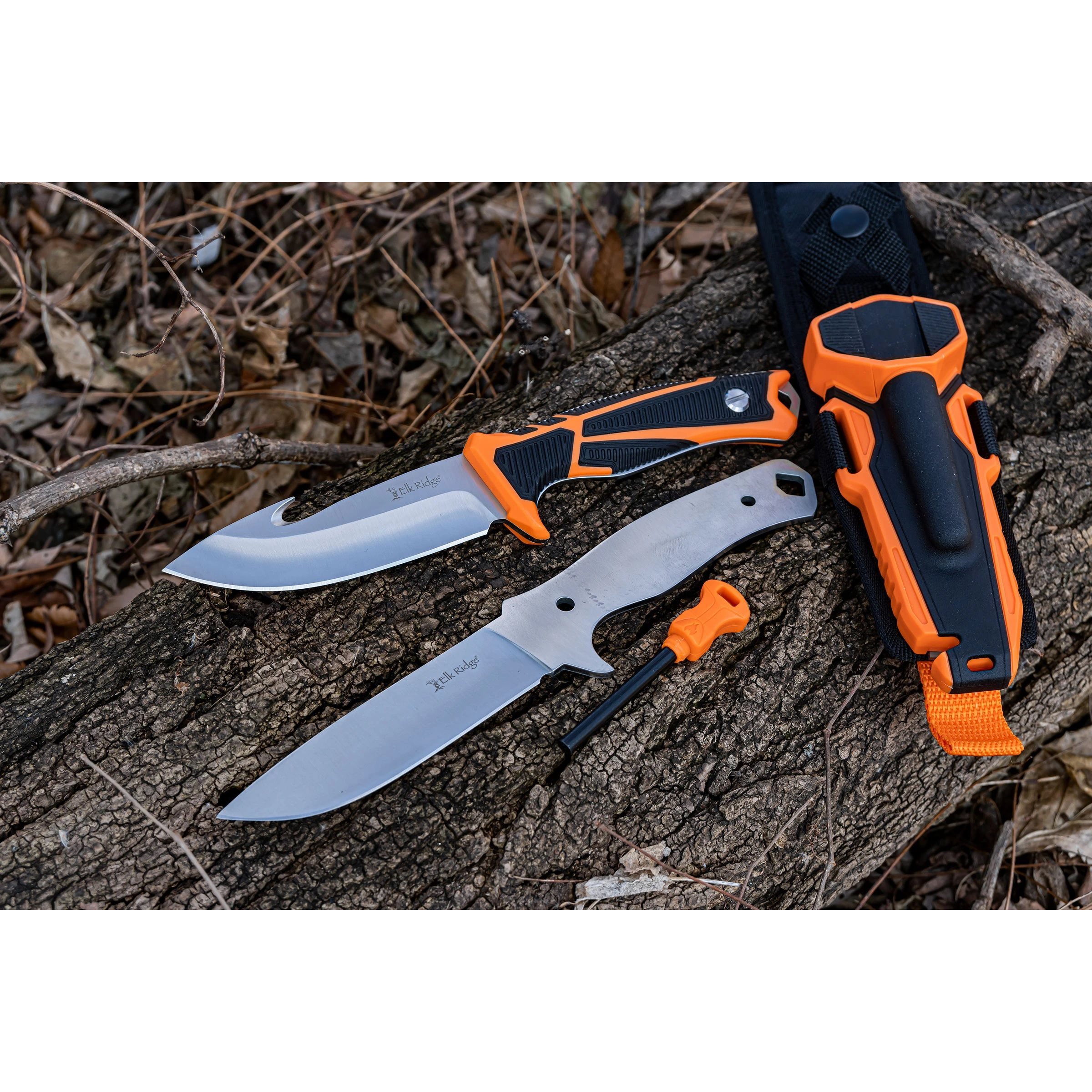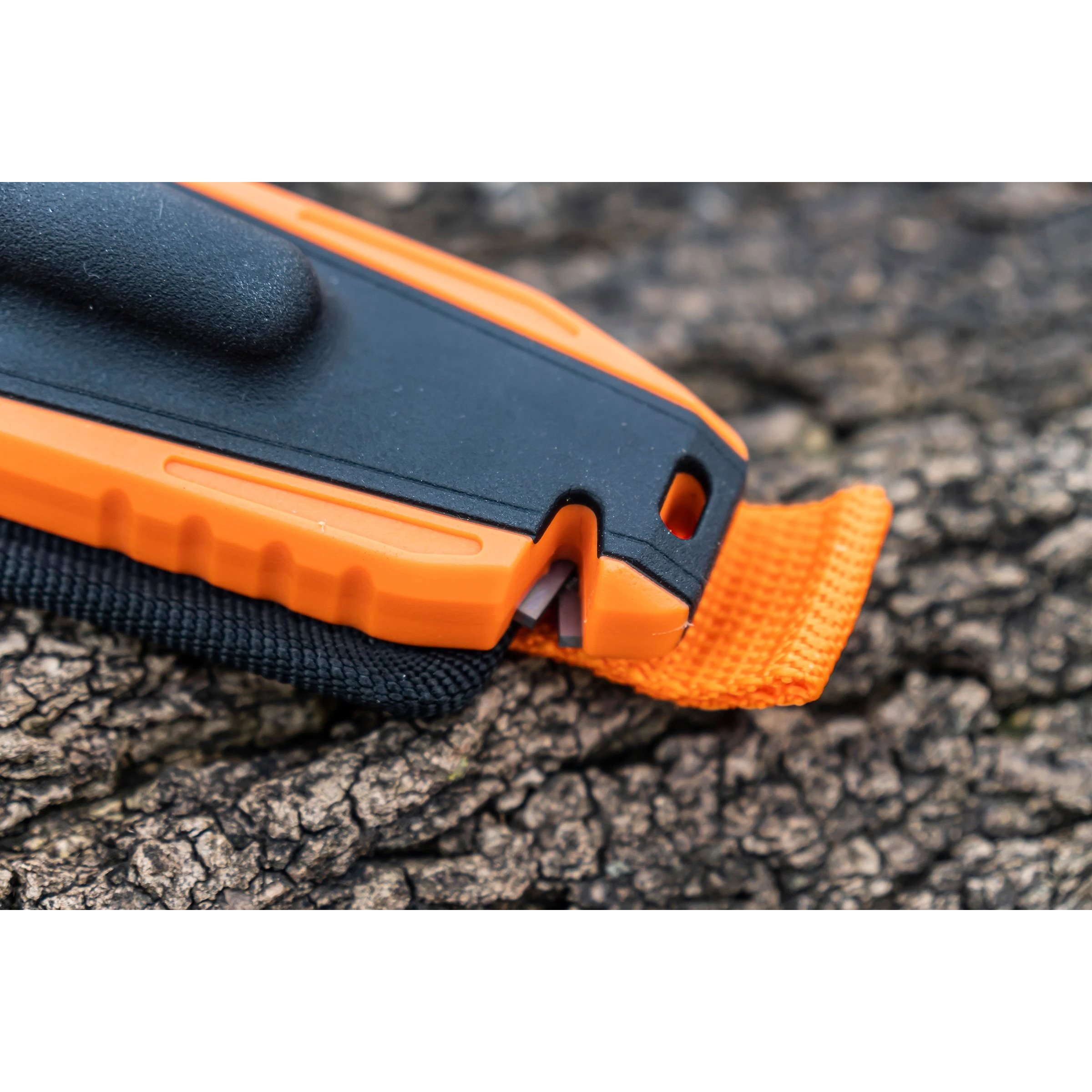 Le paquet contient deux couteaux à soie pleine, tous deux dotés d'une lame lisse, l'un d'eux étant également équipé d'un couteau à lame fixe. Le manche ergonomique et confortable est muni d'une vis proéminente qui permet de changer très facilement les lames. Il suffit de la dévisser, de tourner la poignée et de retirer la lame. En procédant de manière inverse, vous insérez la lame dans le couteau. Le manche est antidérapant, ce qui garantit un travail en toute sécurité, même dans des conditions humides et avec des gants. , vous insérez la lame dans le couteau. Le manche est antidérapant, ce qui garantit un travail sûr même dans des conditions humides et avec des gants. À l'extrémité de la lame des deux couteaux se trouve un œillet proéminent dans lequel vous pouvez passer un cordon. Le boîtier contient un briquet avec un grattoir et, dans la partie inférieure, vous trouverez deux lames tranchantes qui servent de coupe-cordage. Le boîtier est fabriqué à partir d'une combinaison de