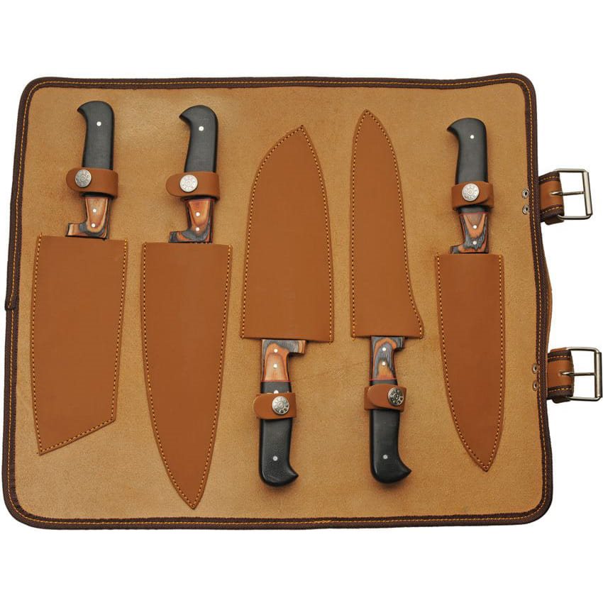 Ensemble de cinq couteaux qui sera apprécié par tout cuisinier. Les couteaux sont fabriqués en acier damassé et sont livrés dans un étui en similicuir.