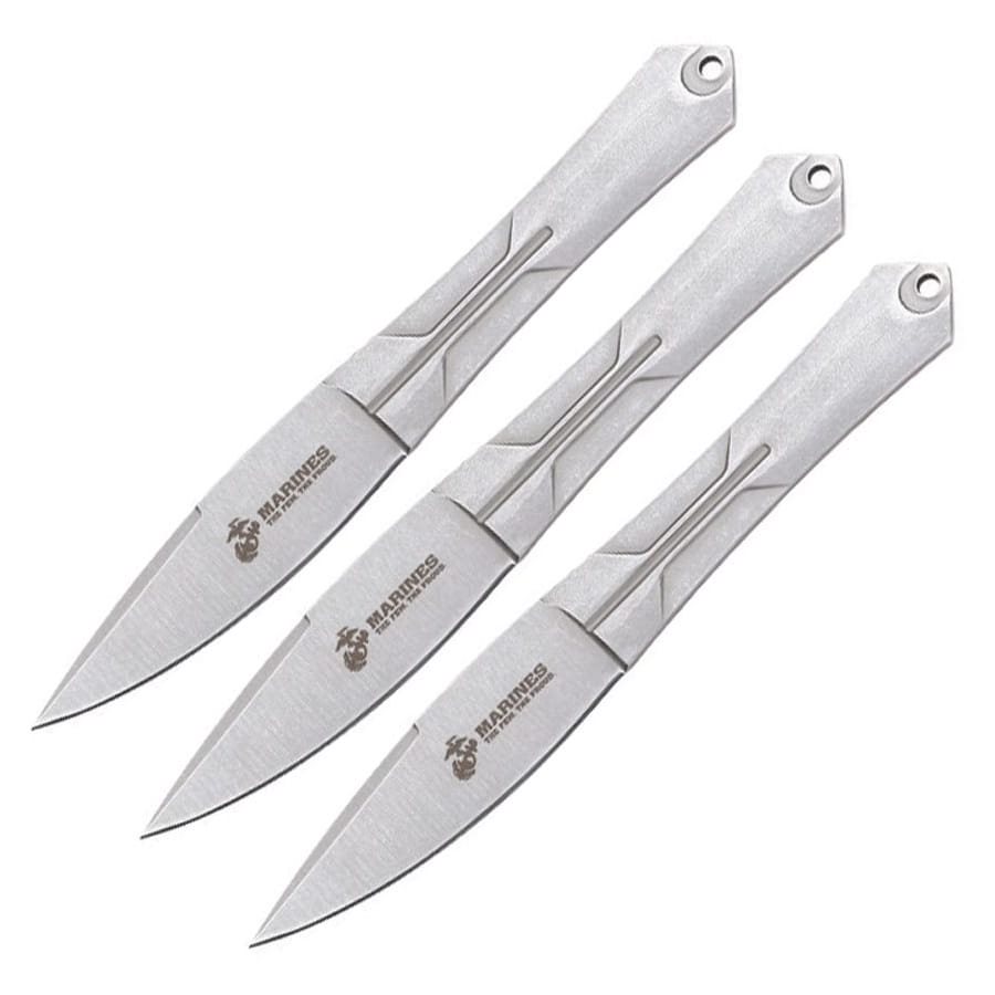Ensemble de trois couteaux en acier inoxydable parfaitement équilibrés, portant le logo officiel sous licence USMC. Plus d'informations