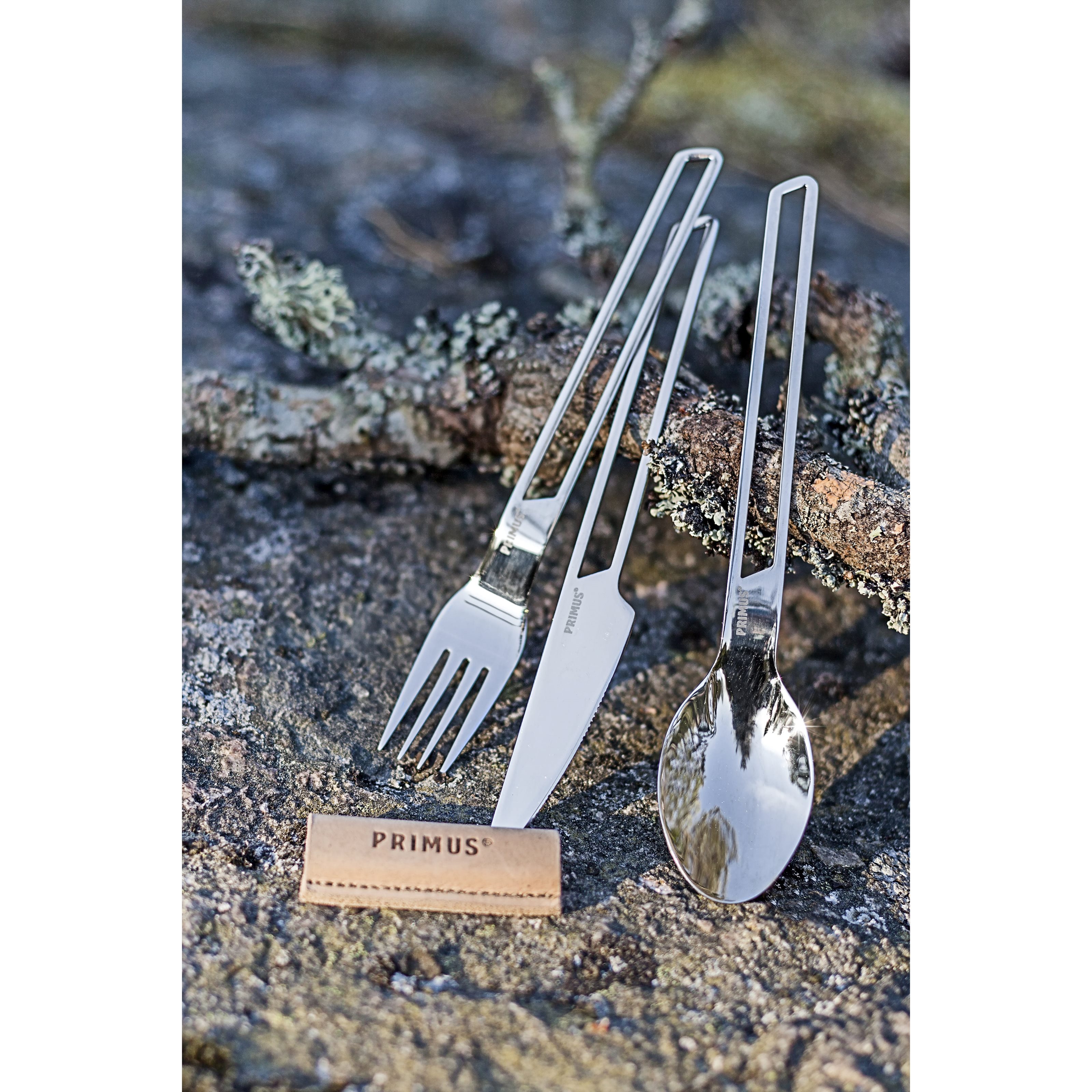 Le set de couverts esthétique de la série Primus Campfire comprend une cuillère, une fourchette et un couteau, tous fabriqués en acier inoxydable de haute qualité. Le set présente non seulement un design élégant, mais également pratique. Le support en cuir maintient les couverts ensemble et empêche qu'ils ne s'entrechoquent, ce qui s'harmonise parfaitement avec le style général. ensemble et les empêche de s'entrechoquer, ce qui s'harmonise parfaitement avec le style général. Ses dimensions sont de 18,5 x 4 cm.