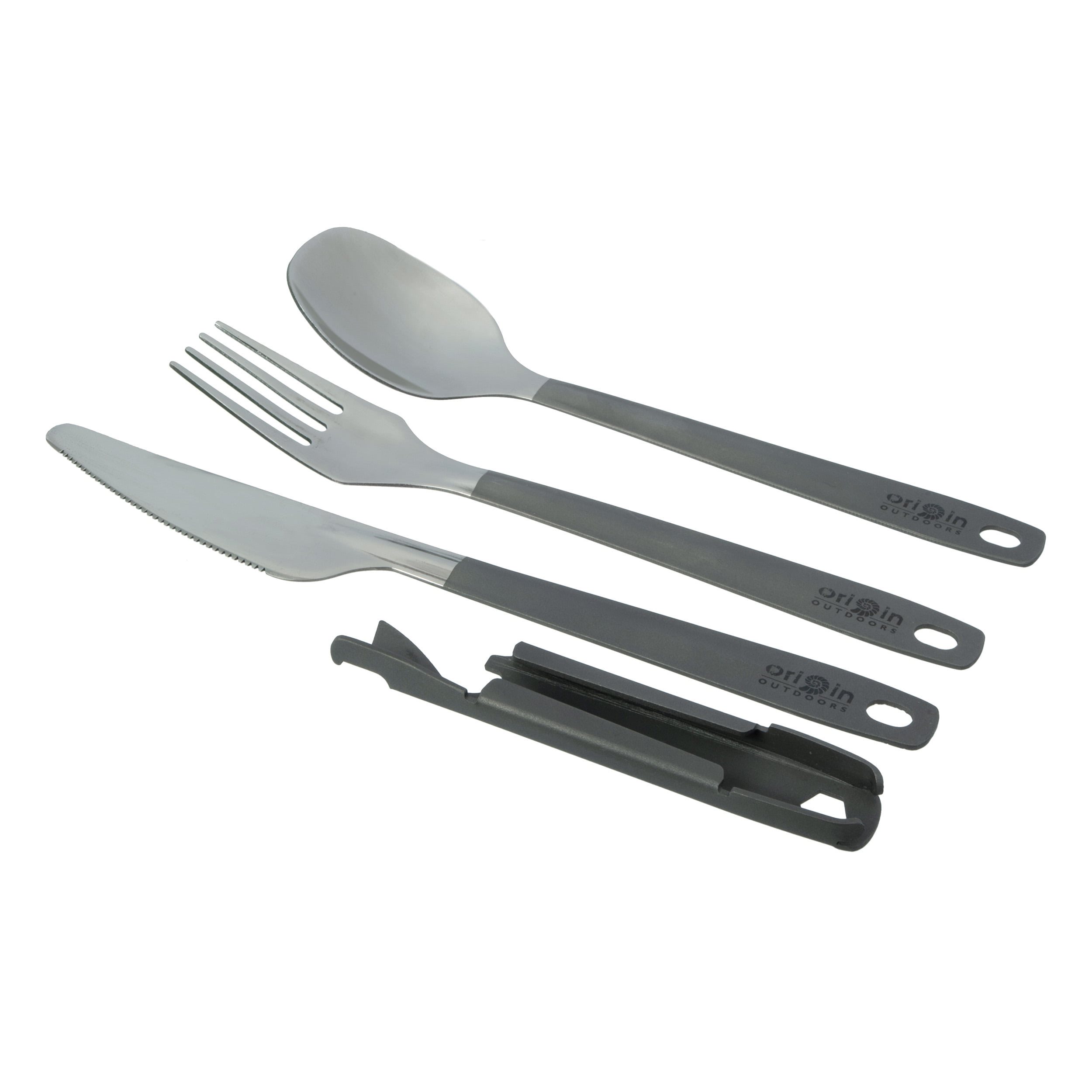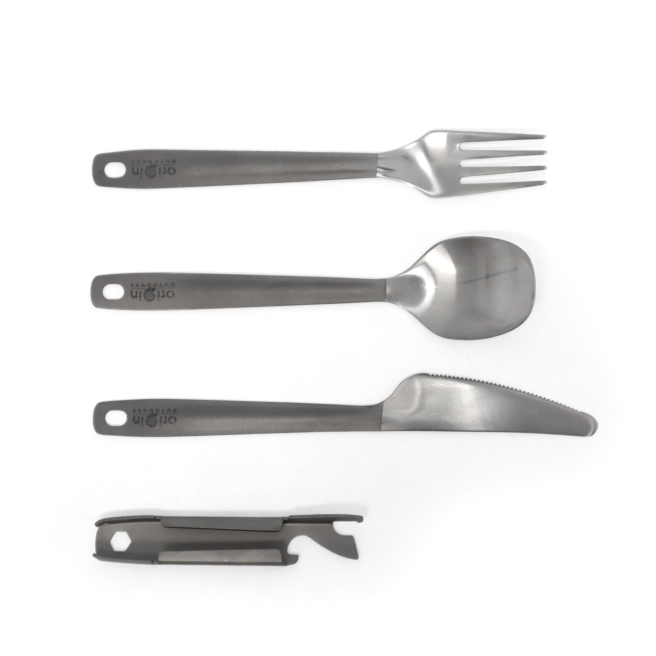 Couverts en titane légers mais résistants, composés de quatre pièces. Ils sont faciles à démonter et à remonter et sont équipés d'orifices permettant d'y enfiler un mousqueton de sécurité, ce qui vous permet de fixer facilement l'ensemble à votre équipement. Le couteau, la fourchette et la cuillère ont une surface traitée par sablage. Le porte-couverts est équipé d'un décapsuleur, d'un ouvre-bouteille et d'une clé hexagonale de taille 7.