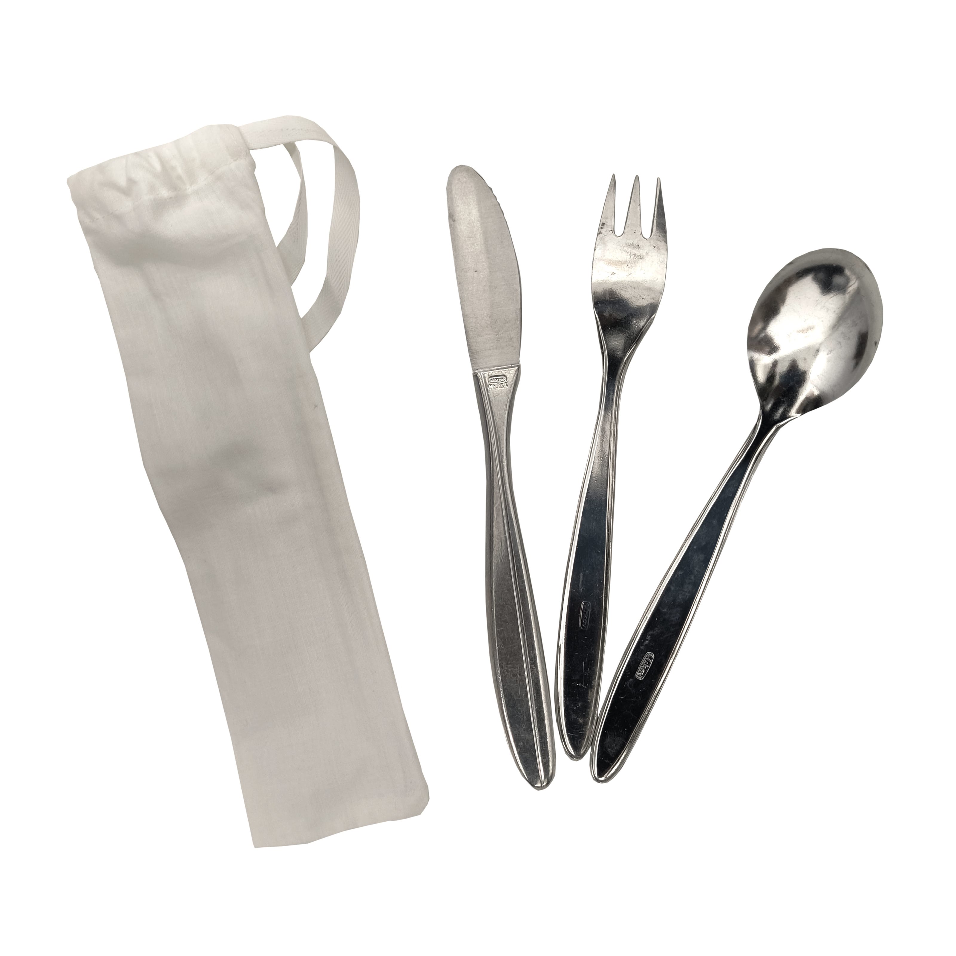 Set de couverts - couteau, fourchette, cuillère à soupe. Rangé dans un étui en tissu blanc. Matériau : aluminium.