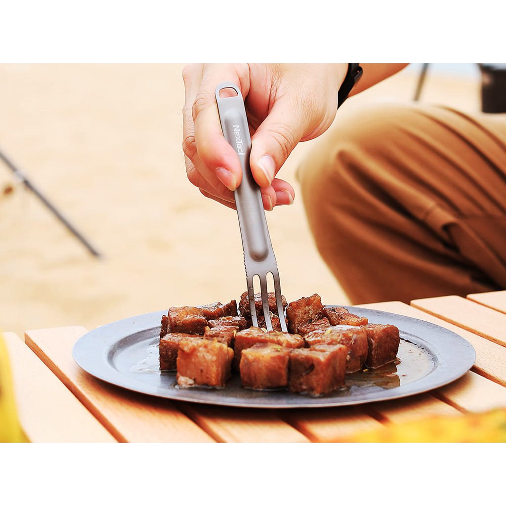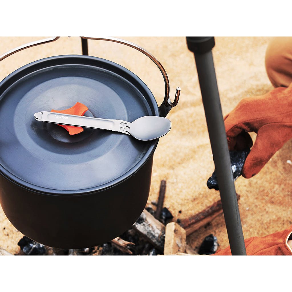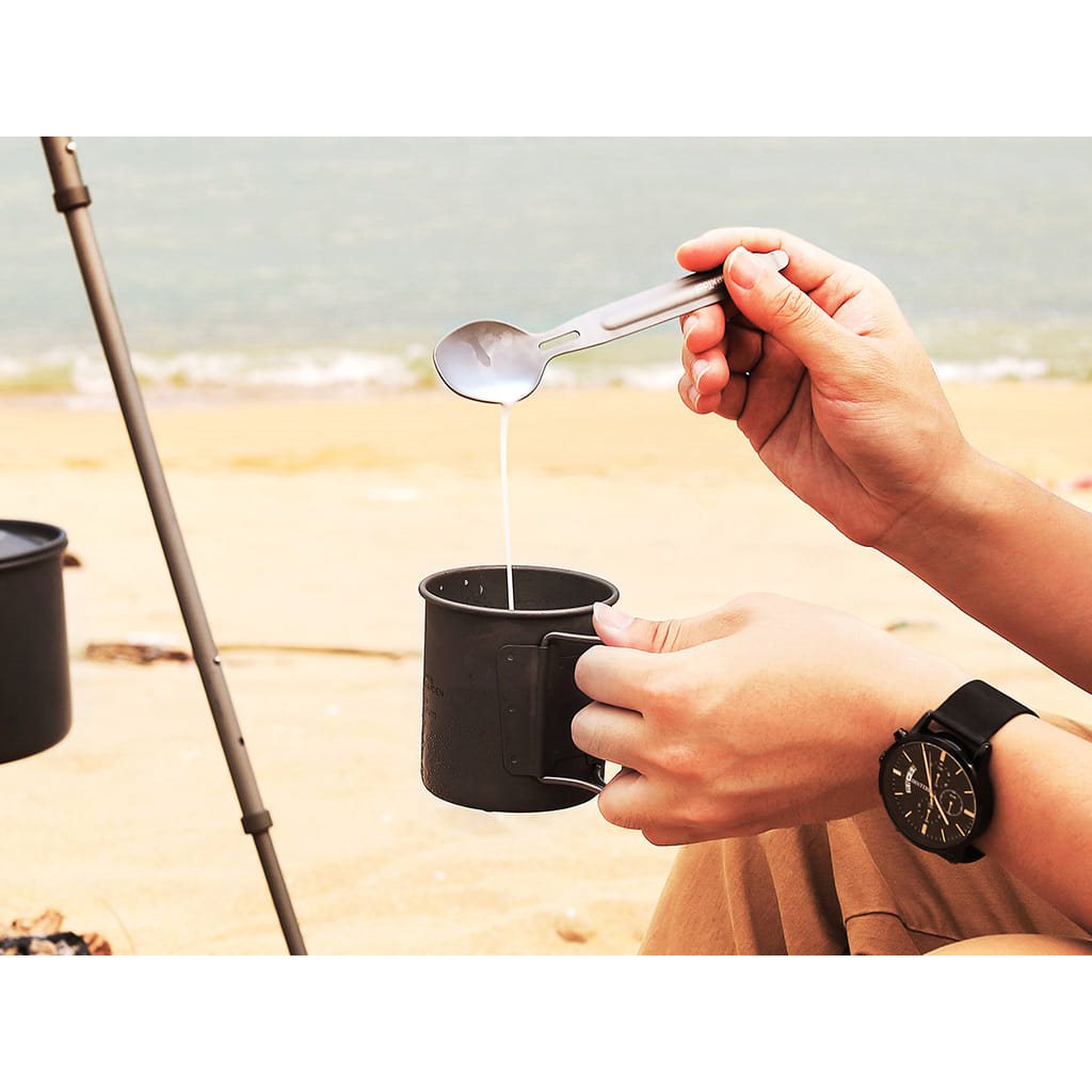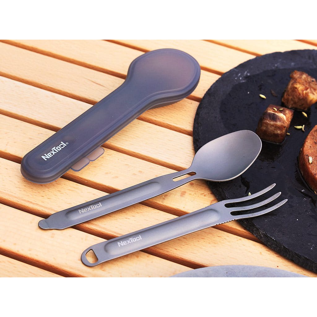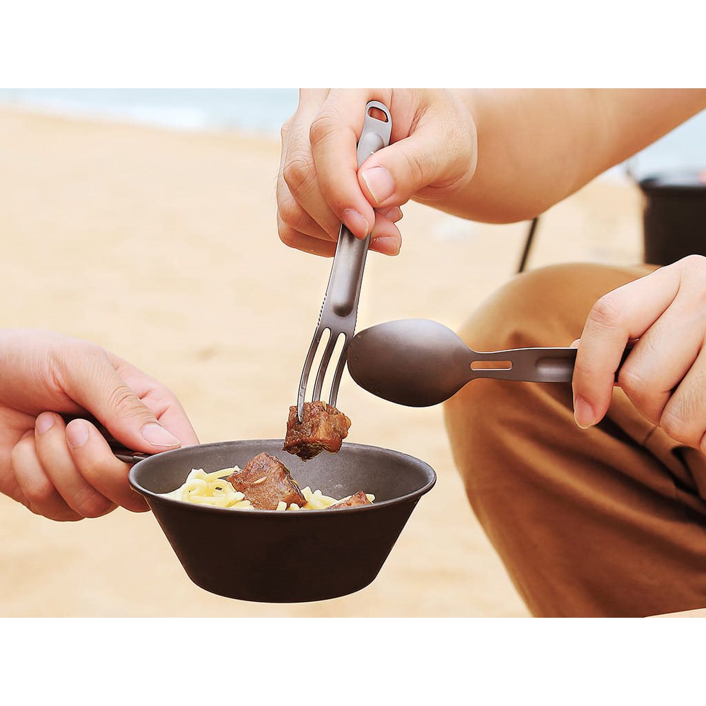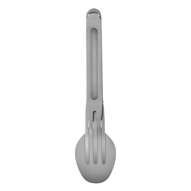 Couverts compacts en titane en deux parties, faciles à assembler. Les couverts sont fabriqués en titane TA1 alimentaire ultra-léger, qui se caractérise par son poids extrêmement faible. La fourchette peut être insérée dans la cuillère par l'ouverture, puis les couverts peuvent être rangés dans leur ensemble dans l'étui de voyage fourni.