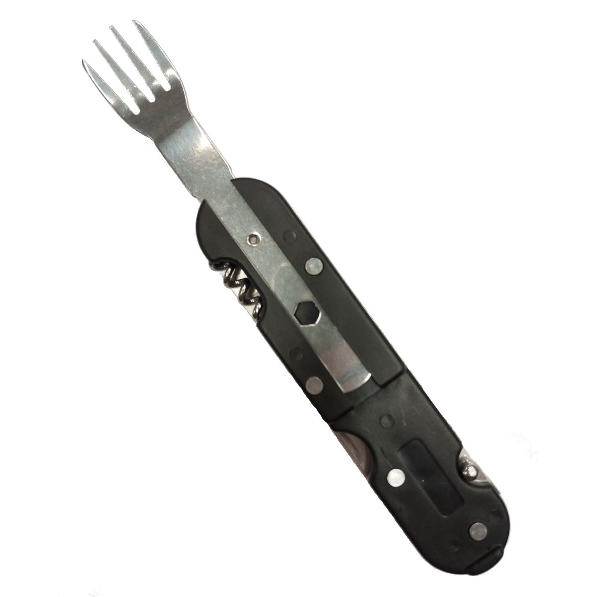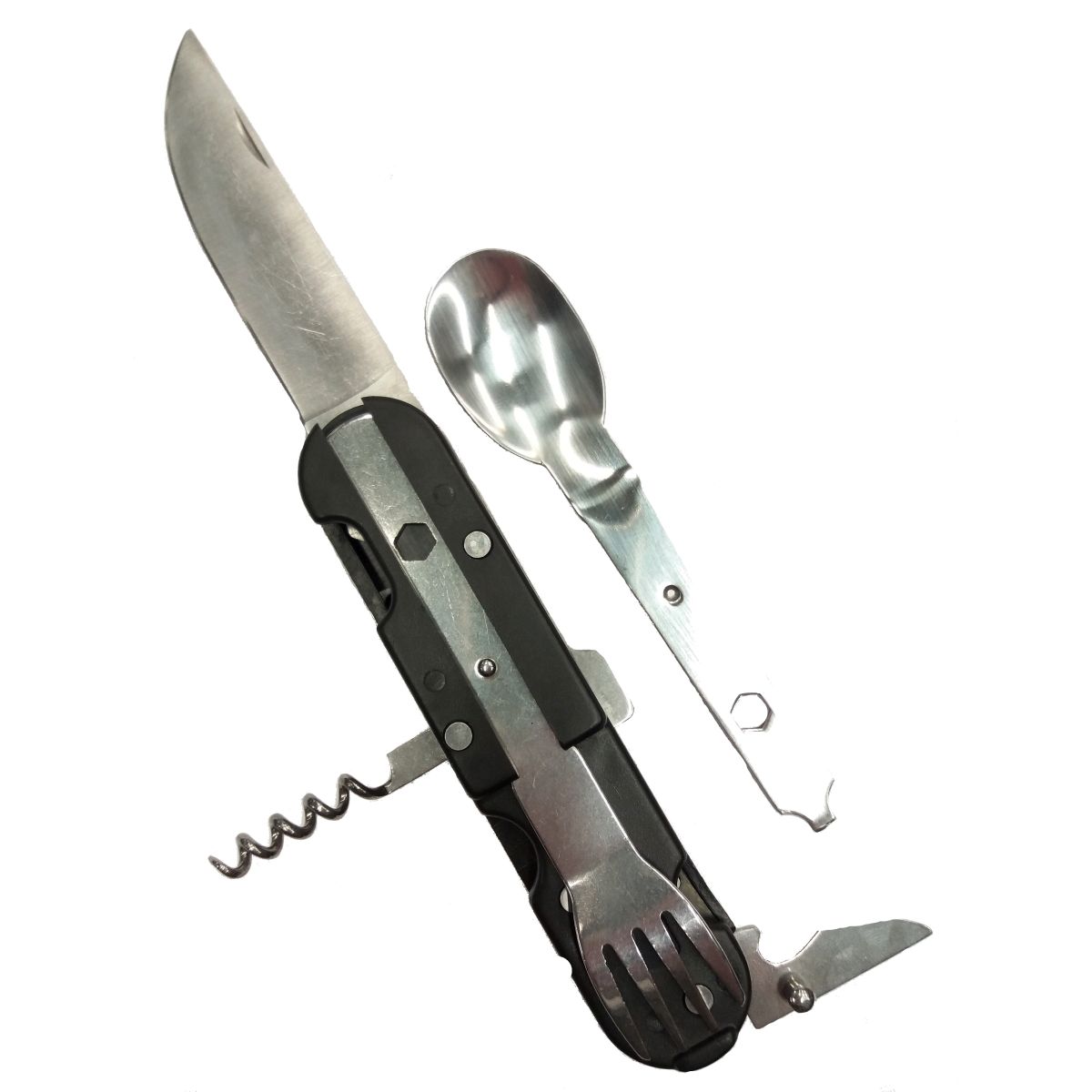 L'outil comprend : un couteau, une fourchette, une cuillère, un tire-bouchon et un ouvre-boîte. Plus d'informations
