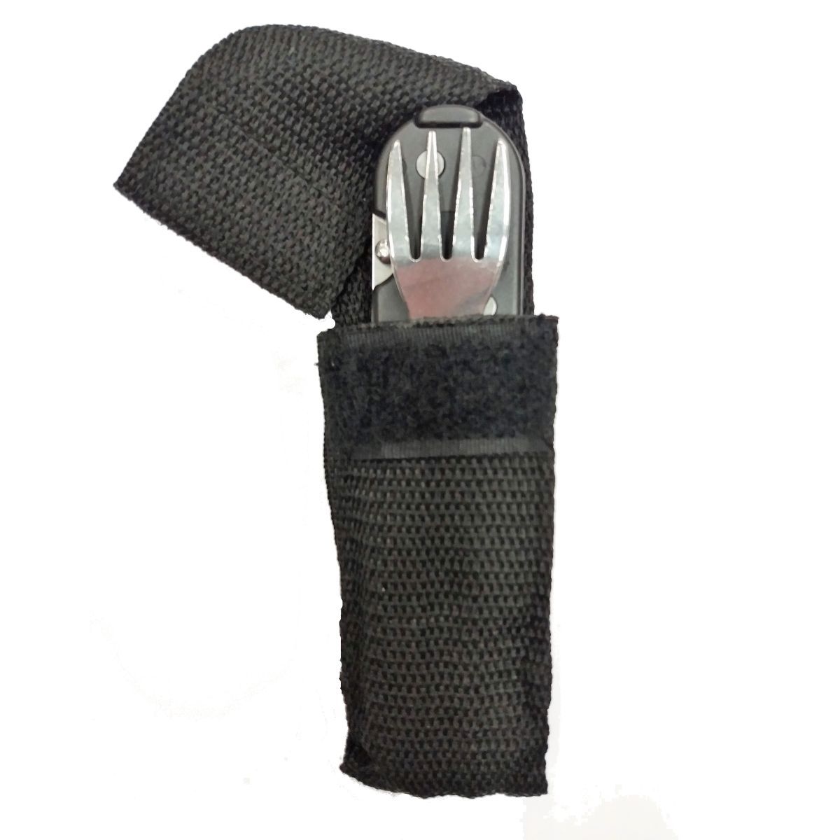 Couverts pliants légers et résistants dans un étui en nylon noir.