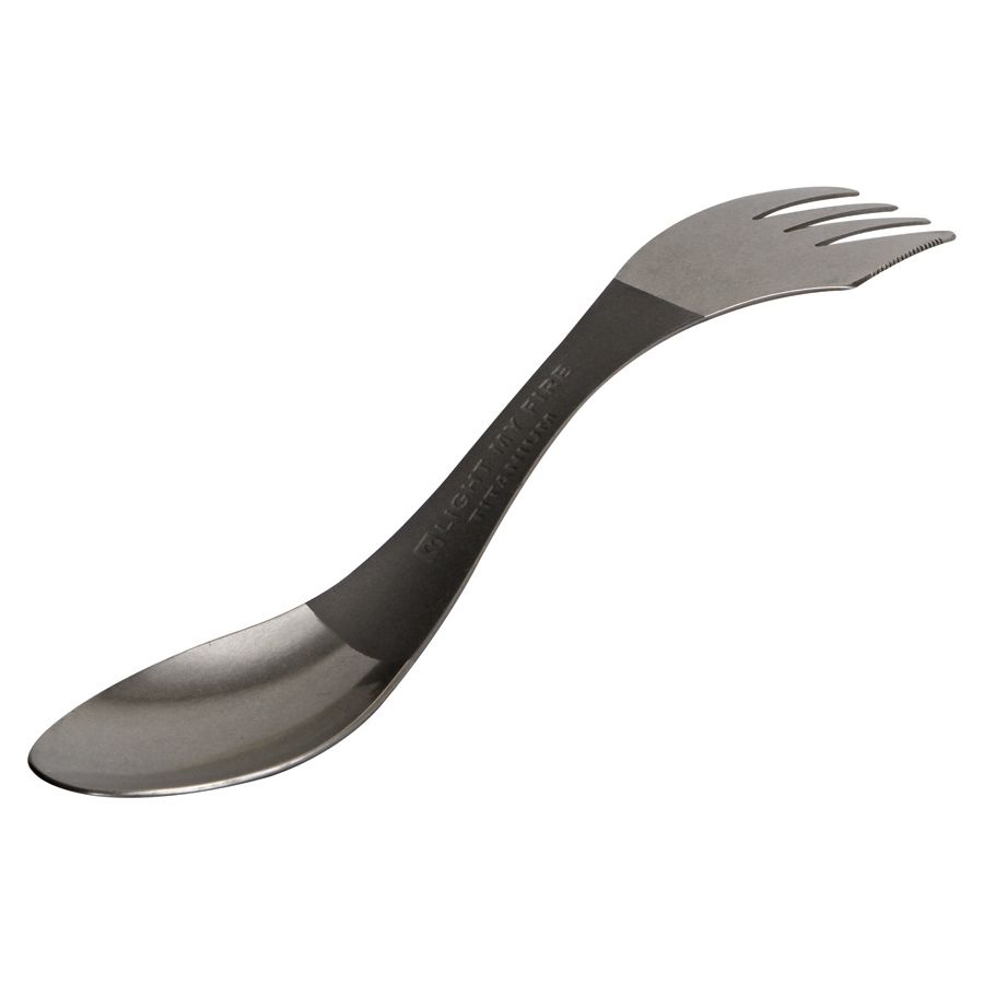 Cuillère, fourchette et couteau en un (le couteau fait partie de la fourchette). Fabriqué en titane. Dimensions : 170 x 39 x 20 mm, poids : 20 g. Plus d'informations