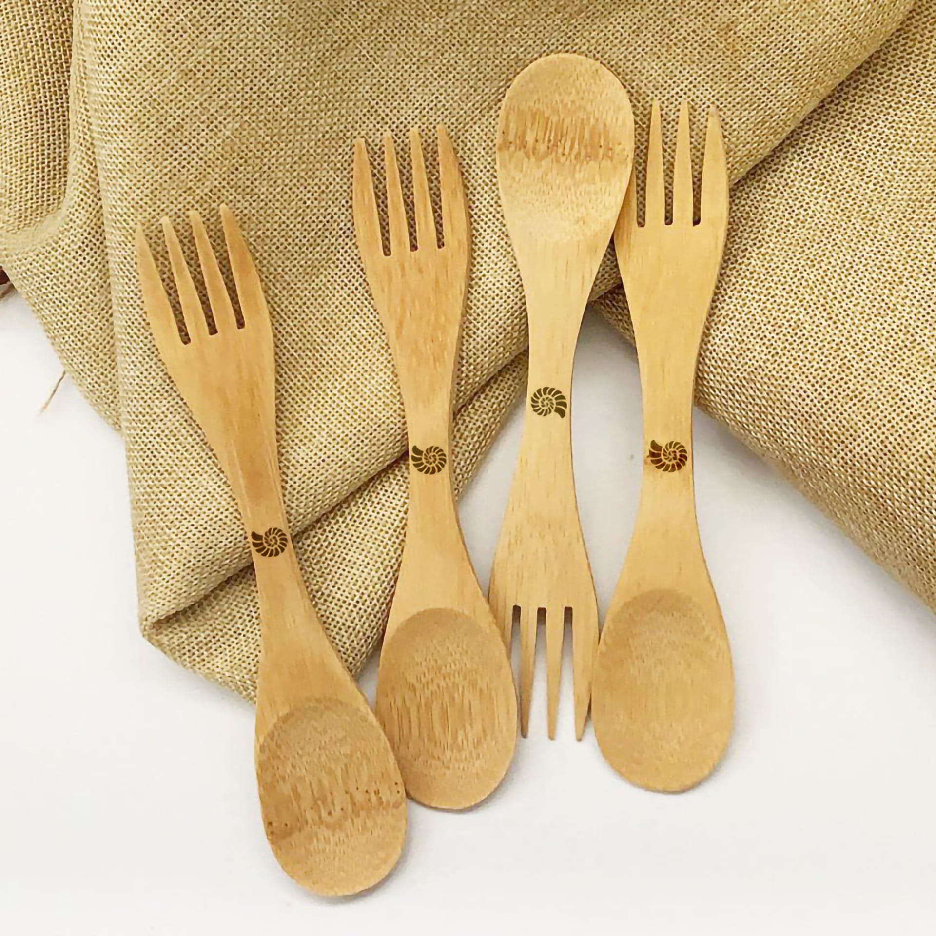 Ce spork (mot-valise formé à partir des mots anglais « spoon » (cuillère) et « fork » (fourchette) fork) en bambou est naturellement antibactérien et n'altère pas le goût des aliments. Léger et résistant, il combine une cuillère et une fourchette en un seul ustensile, ce qui en fait le compagnon idéal pour le trekking, le camping ou la randonnée. Un étui pratique est inclus dans l'emballage. Il est également possible de commander des couverts en bambou de différentes tailles.