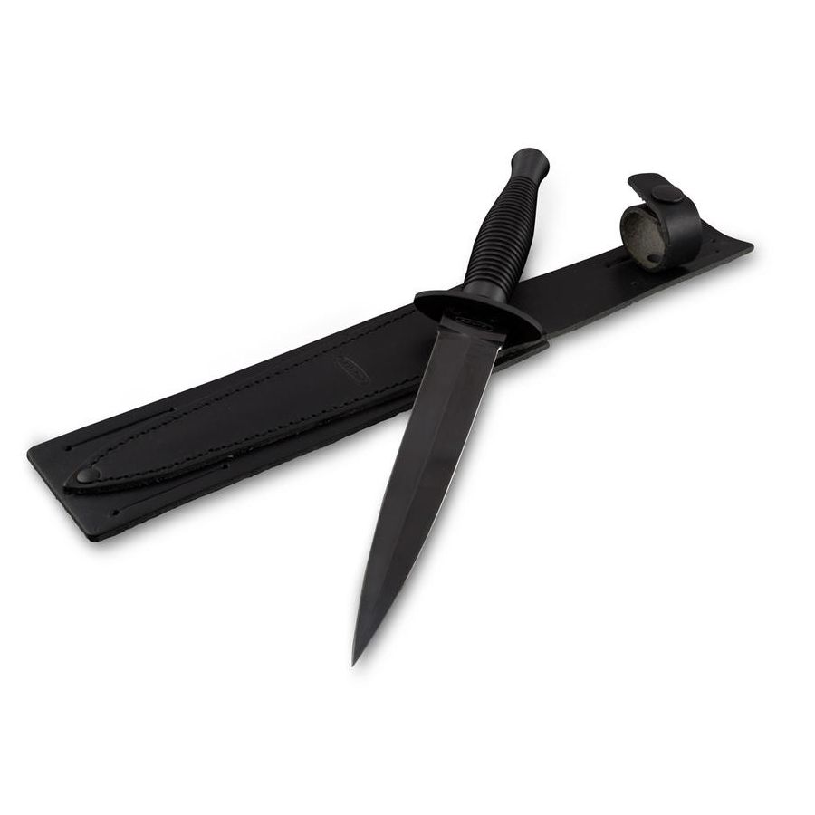 La lame du poignard est fabriquée en acier au carbone de haute qualité de type GR 1070 (12 071) avec une dureté de 55 à 58 HRc et présente un affûtage en biseau, noirci. Le manche du poignard COMMANDOS est en métal rainuré et se termine par une garde qui empêche la main de glisser. Le poignard 399-OK-1 COMMANDOS est livré dans un étui en cuir noir.
