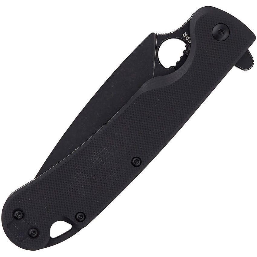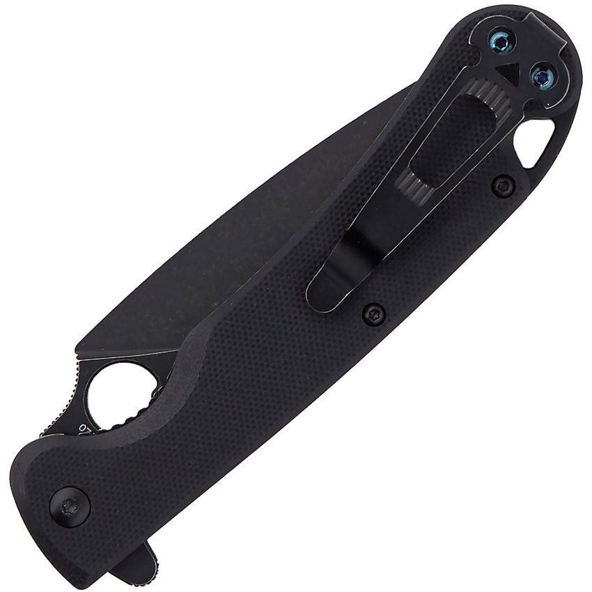 Couteau de style de la marque DAGGERR avec une structure noircie. La lame à tranchant lisse en forme de poignard avec un faux tranchant supérieur est fabriquée en acier à outils D2 de haute qualité, qui offre un bon rapport entre résistance et résistance à la corrosion. En position ouverte, le couteau est sécurisé par un verrou LinerLock éprouvé depuis des années. Pour faciliter l'ouverture d'une seule main, le couteau est équipé d'un flipper relativement prononcé. Le manche est légèrement incurvé pour s'adapter parfaitement à la main et les plaquettes sont en G10 avec une texture antidérapante fine. À l'extrémité du manche, vous trouverez un trou pratique pour passer un cordon de sécurité et un clip de poche en métal.