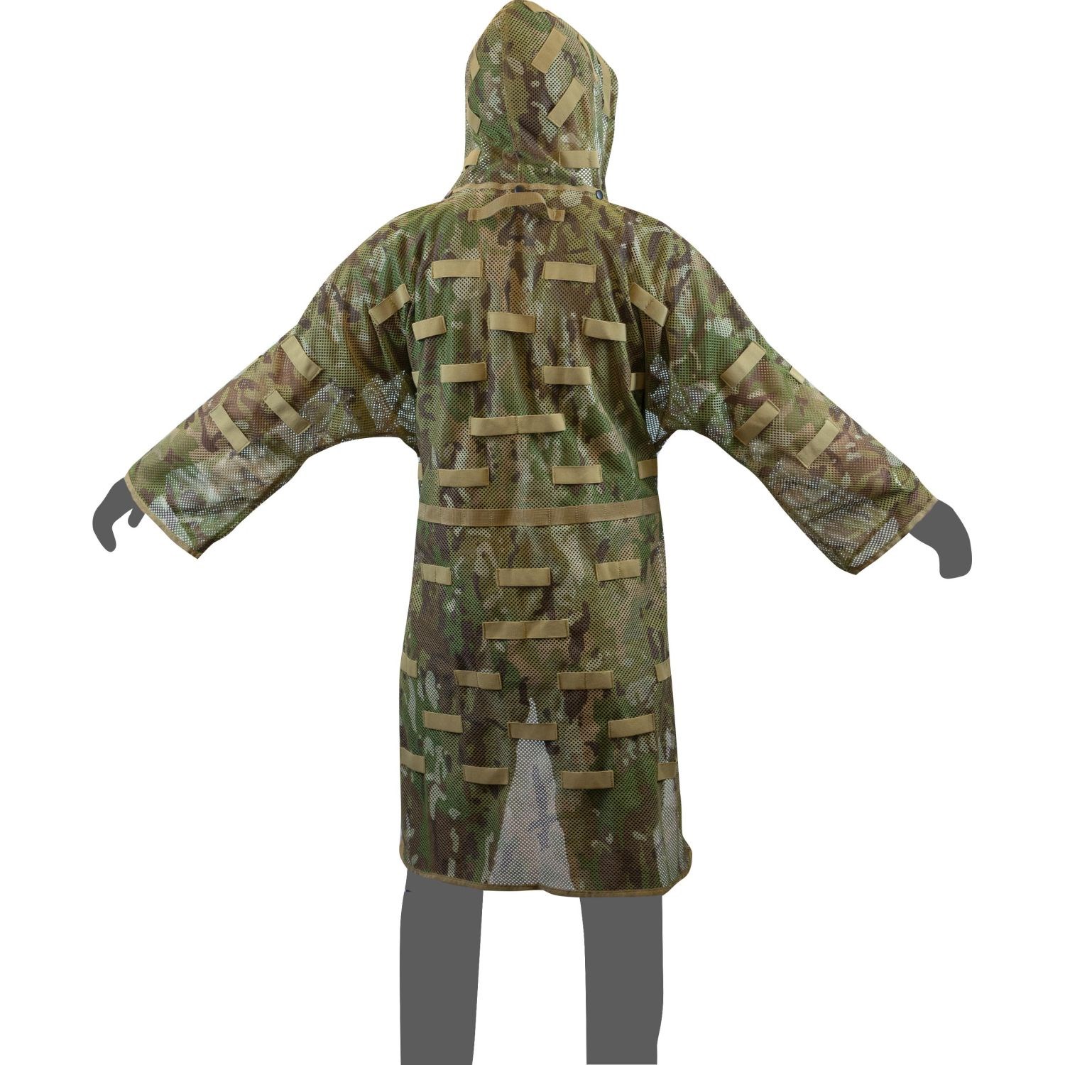 Cape de camouflage légère et aérée, dotée de solides boucles élastiques pour fixer de la végétation ou d'autres objets. Capuche amovible, deux sangles thoraciques et une sangle à la taille. Taille universelle.