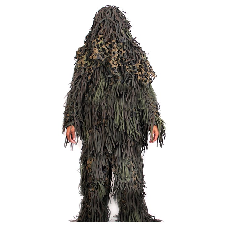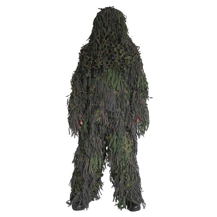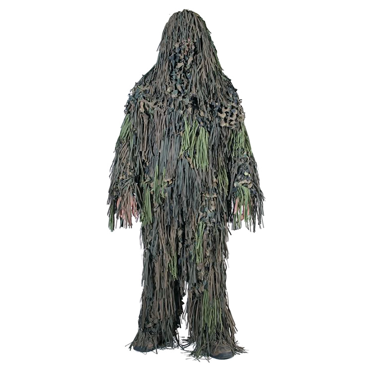 Tenue de camouflage. Motif feuilles 3D. Fabriquée dans un tissu maillé confortable, très léger et sans bruit. Traitée contre les insectes. Matériau résistant aux intempéries et à la moisissure. 3 pièces : pantalon, veste, couvre-chef. Plus d'informations