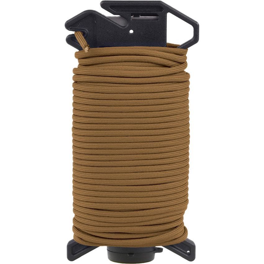 Distributeur pratique - dérouleur de cordon (cordon parachute/cordon de parachute/paracorde ou tout autre type de cordon). de cordon déroulé est coupée à l'aide d'un cutter intégré. Le centre du corps du dérouleur est creux et peut accueillir un briquet (non fourni). Sa fonction principale n'est pas, dans ce cas, d'allumer une cigarette, mais de sceller l'extrémité du cordon afin qu'il ne s'effiloche pas. Le paquet contient un cordon paracorde de 30 mètres que vous pouvez fixer pour éviter qu'il ne se déroule accidentellement en plaçant l'extrémité dans la découpe prévue à cet effet sur le distributeur. Le distributeur est muni de deux crochets métalliques qui permettent de l'accrocher à un sac à dos ou à un sac de sport.