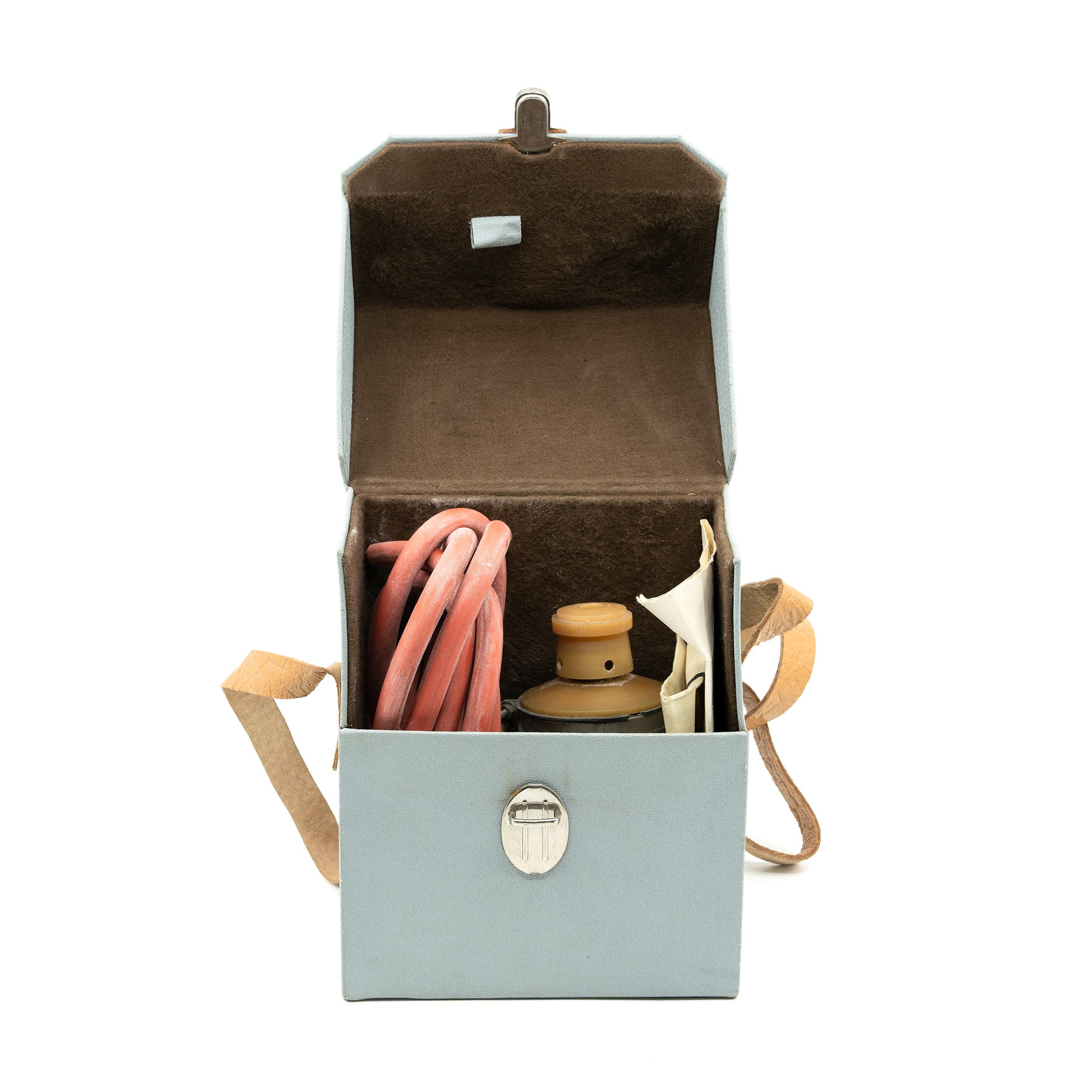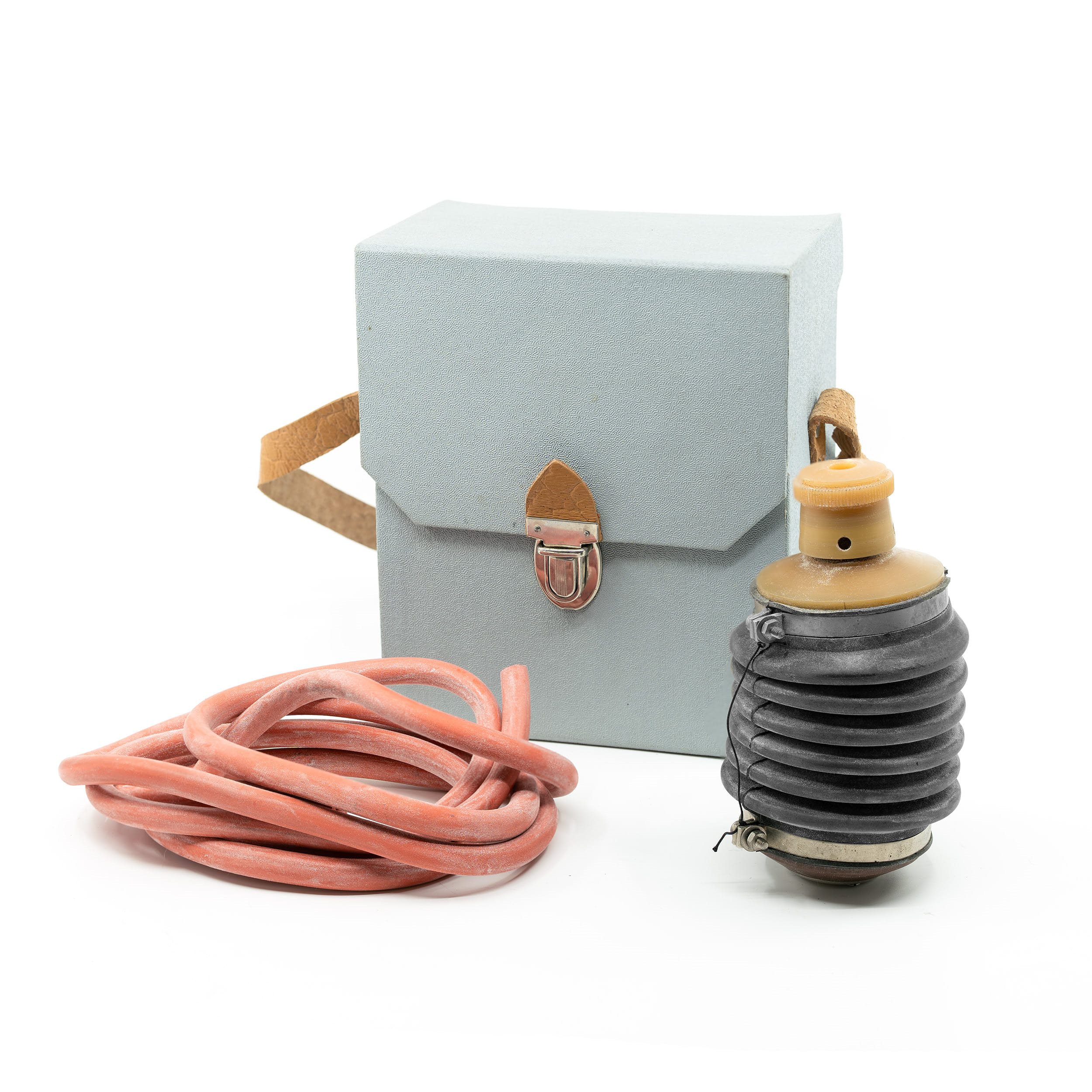 Description : L'appareil est essentiellement un soufflet en caoutchouc avec une spirale en acier, fermé des deux côtés par des couvercles en plastique. Le couvercle supérieur est muni d'un embout dans lequel s'insèrent les tubes de détection. Le couvercle inférieur est équipé d'un dispositif anti-casse.