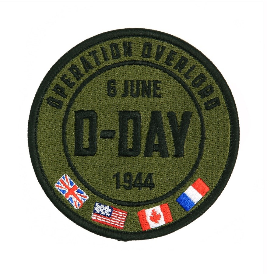 Au centre de l'écusson figurent les inscriptions « 6 June », « D-Day » et l'année « 1944 », tandis que sur le pourtour sont représentés l'inscription « Operation Overlord » et les drapeaux colorés de la Grande-Bretagne, des États-Unis, du Canada et de la France. Dimensions : 8,3 cm.