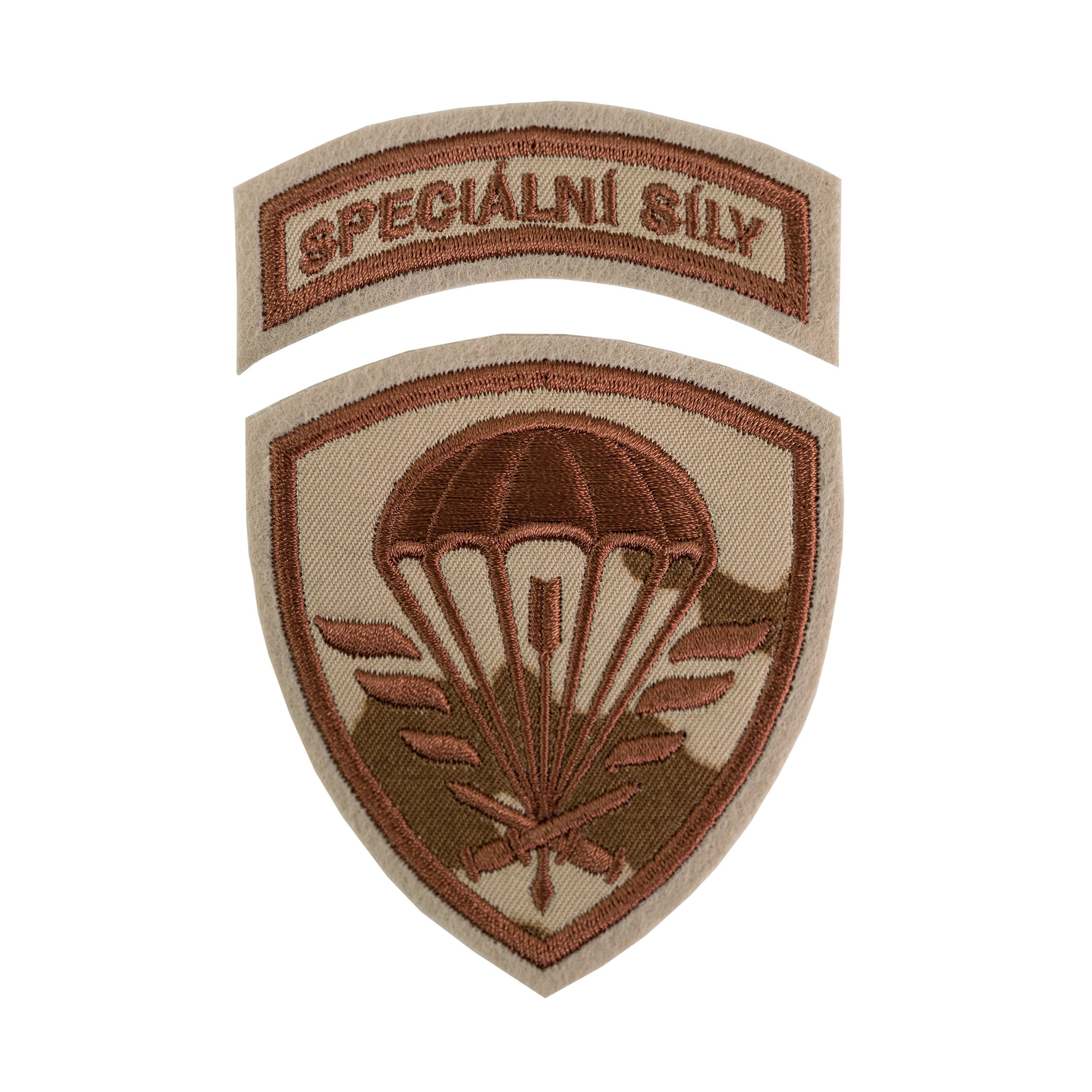 Écusson en deux parties FORCES SPÉCIALES de l'armée tchèque. Modèle camouflage désert vz.95 DESERT. Dimensions : environ 7 x 8 et 7 x 2,5 cm. Plus d'informations