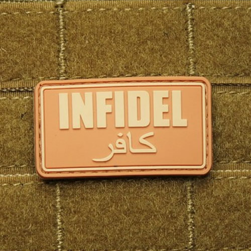 Écusson en plastique destiné à être placé sur un panneau velcro, avec une grande inscription INFIDEL (infidèle, non-croyant). Dimensions : environ 5 x 3 cm. Plus d'informations