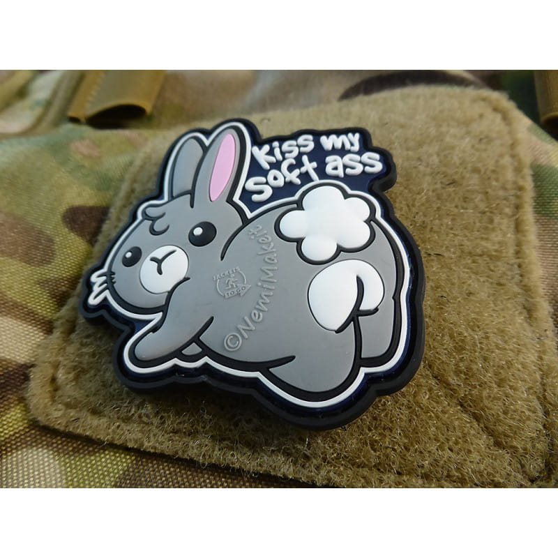 Écusson en plastique à fixer sur un panneau velcro. Lapin présentant ses fesses et inscription « Kiss my soft ass » (embrasse mes fesses douces). Dimensions : 7,6 x 7,1 cm. Plus d'informations