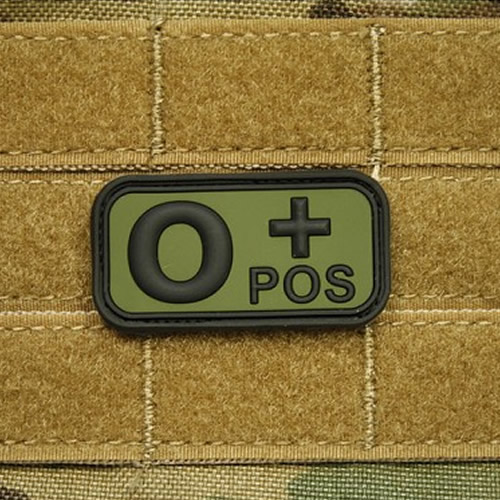 Écusson en plastique indiquant le groupe sanguin. Dimensions : environ 5 x 2,5 cm, avec velcro au dos.