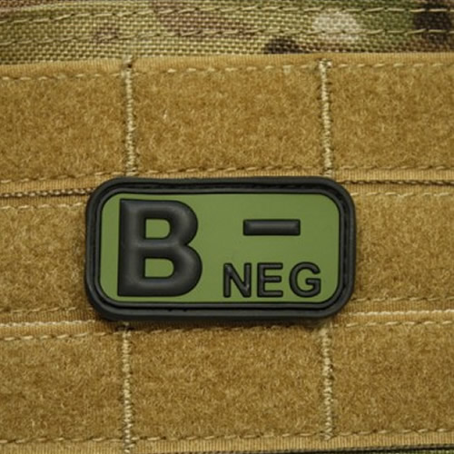 Écusson en plastique indiquant le groupe sanguin. Dimensions : environ 5 x 2,5 cm, avec velcro au dos.