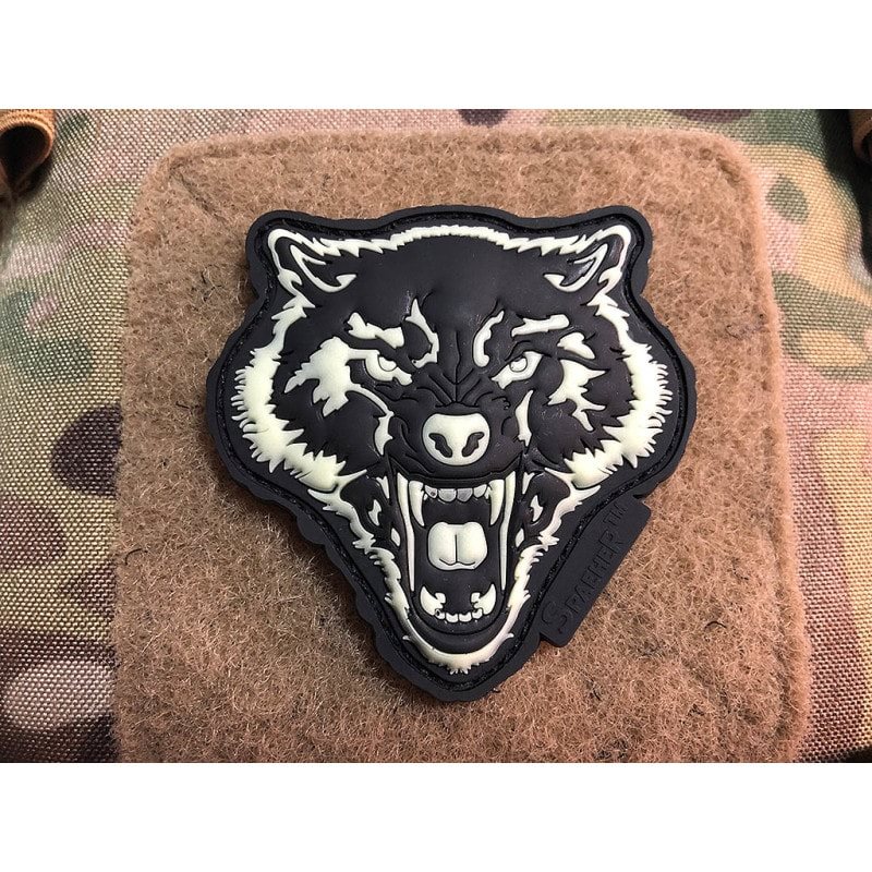 Écusson en caoutchouc 3D à fermeture velcro avec une représentation détaillée d'un loup montrant les crocs. La dimension de l'écusson à son point le plus large est d'environ 7 x 6,7 cm et il sera parfaitement mis en valeur sur votre veste, sweat-shirt, casquette ou sac à dos. L'écusson est en plastique résistant, il est donc facile à nettoyer : il suffit de l'essuyer avec un chiffon humide. La version Glow in the Dark (l'écusson brille dans le noir lorsqu'il est éclairé) est particulièrement captivante.