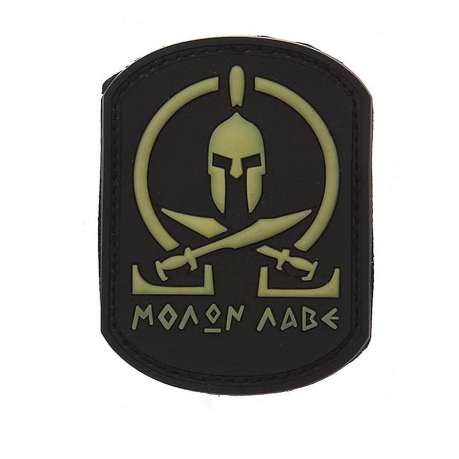 Écusson en plastique avec le motif « MOLON LABE » en noir. Dimensions : environ 5 x 7 cm, avec velcro au dos.