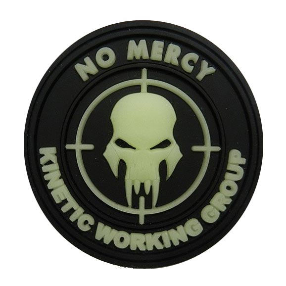 Écusson en plastique avec un motif représentant un crâne au centre d'une cible et l'inscription « No Mercy - Kinetic Working Group ». Diamètre d'environ 6 cm, avec velcro au dos. Glow in the dark - brille dans le noir.
