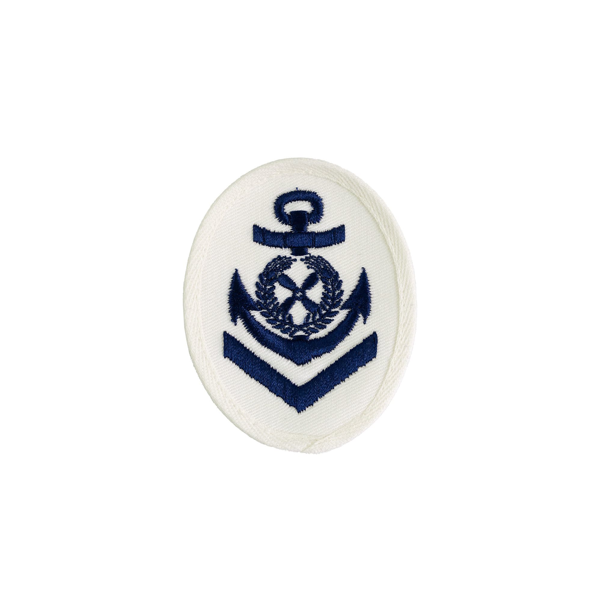 Écusson marin original, broderie bleue sur fond blanc.