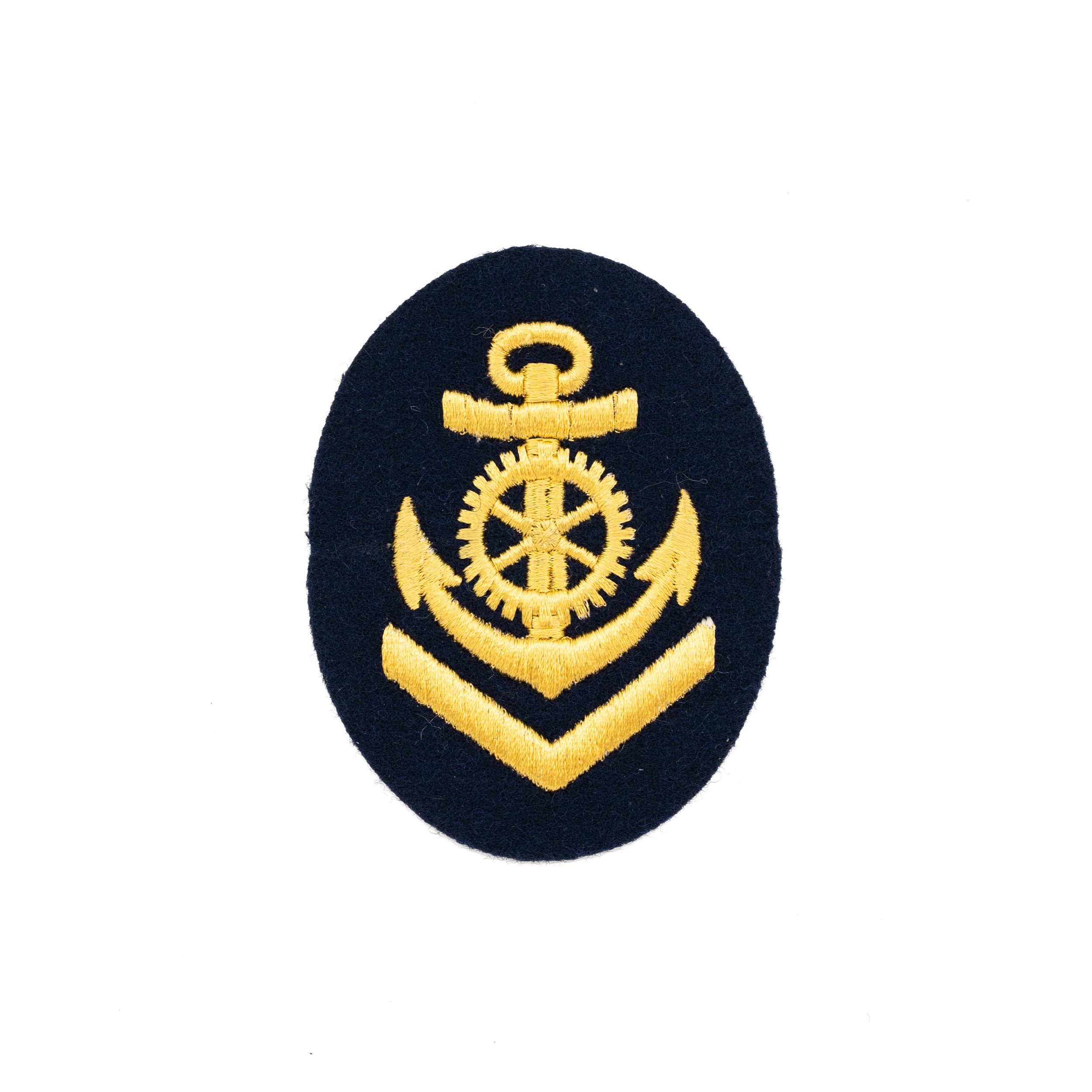 Écusson marin original, broderie dorée sur fond bleu.