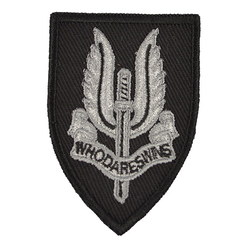 Écusson avec l'emblème argenté des forces spéciales britanniques SAS sur fond noir. Épée ailée avec ruban portant l'inscription WHO DARES WINS. Dimensions de l'écusson : environ 6,5 x 5 cm. Plus d'informations