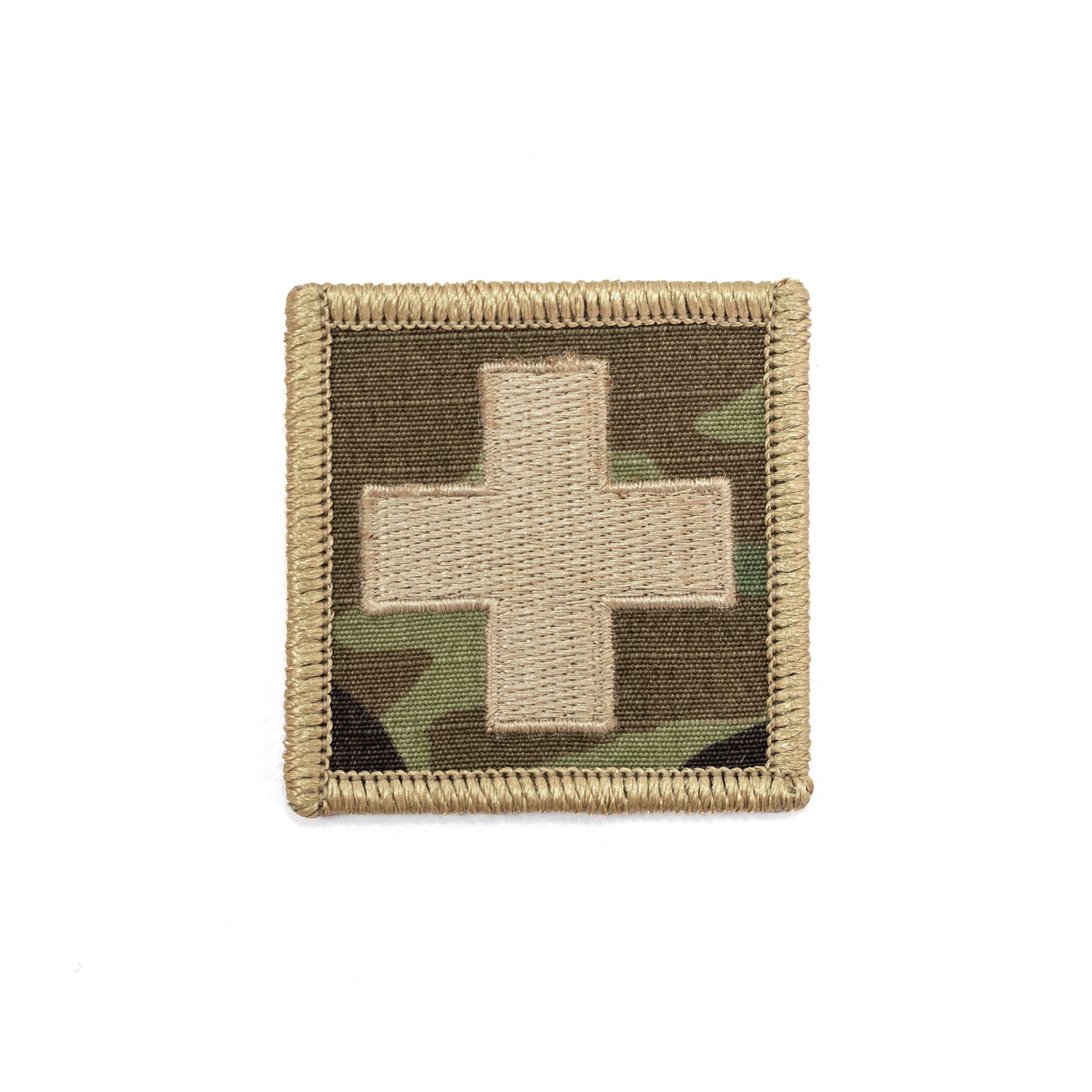 Écusson médical - croix de couleur kaki, sur fond OCP, avec bordure sable (kaki). À fixer à l'aide d'une bande Velcro. Dimensions : environ 5 x 5 cm.