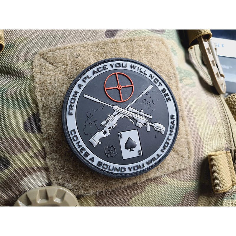 Écusson en plastique avec velcro et inscription « From a place you will not see comes a sound you will not hear » (D'un endroit que vous ne verrez pas vient un son que vous n'entendrez pas). Taille : 7,5 cm. Plus d'informations
