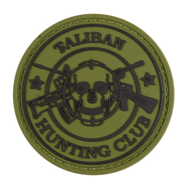 Le patch est en forme de cible et comporte l'inscription « TALIBAN HUNTING CLUB » (club de chasseurs des talibans) ainsi qu'un crâne avec deux fusils en arrière-plan.