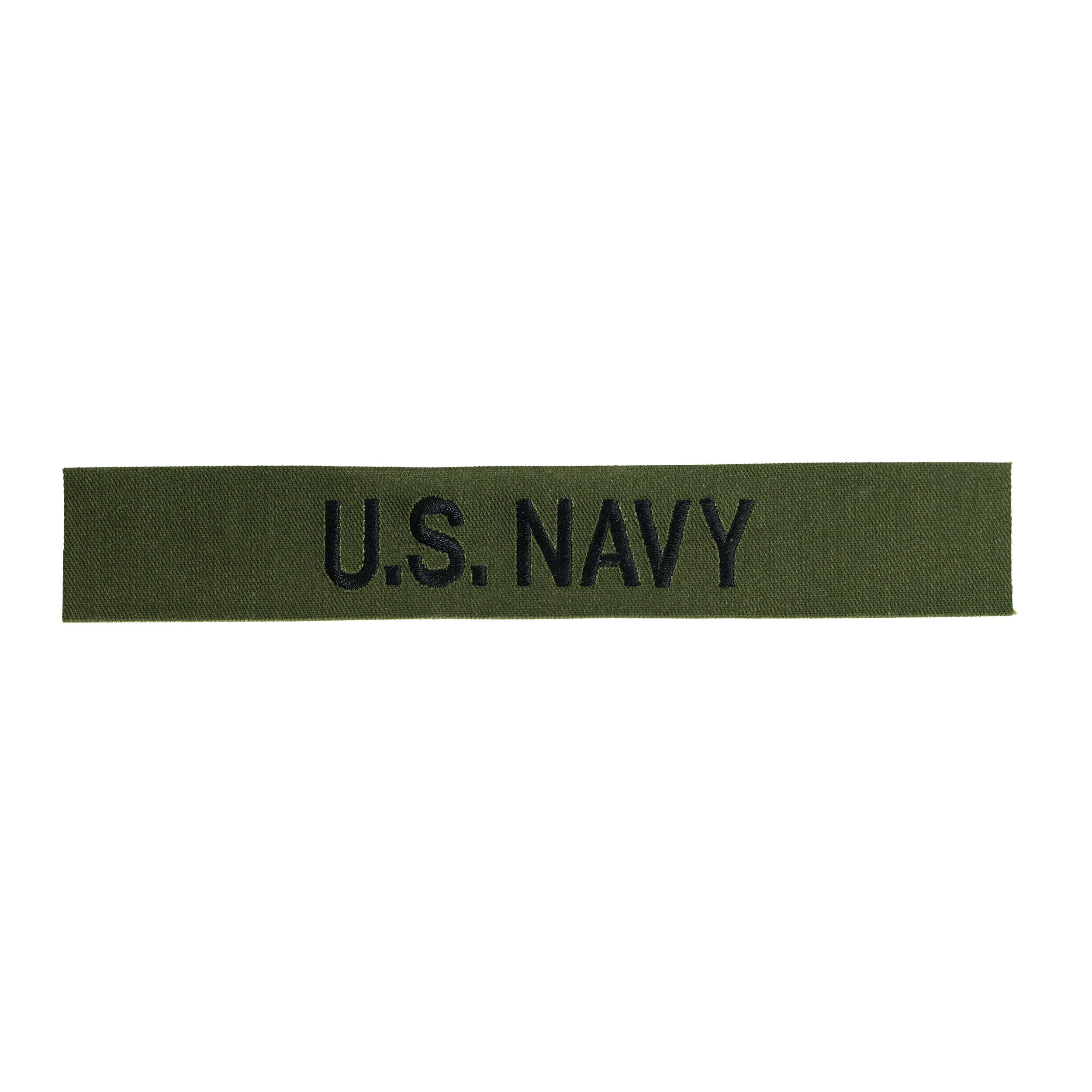 Écusson destiné à être cousu sur un uniforme ou sur des vêtements civils. Inscription « U.S. NAVY » sur fond olive. Fabrication de haute qualité et très précise.
