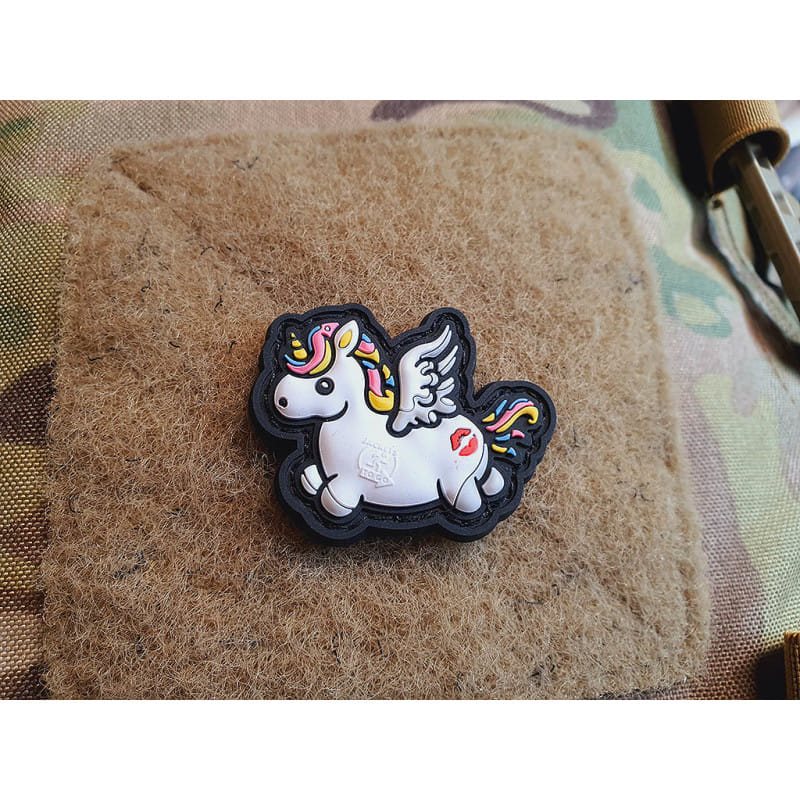 Écusson en plastique représentant une licorne volante avec une empreinte de baiser sur l'arrière. À fixer sur un panneau velcro. Dimensions : 3,6 x 4,2 cm. Matériau : PVC.